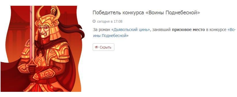 Автор: Марика ВайдЧто же, в очередной раз за текущую неделю в шоке (а ведь попрощалась в блоге до субботы… ага, щас) — моя книга оказалась в числе призёров конкурса «Воины Поднебесной», заняв второе место.