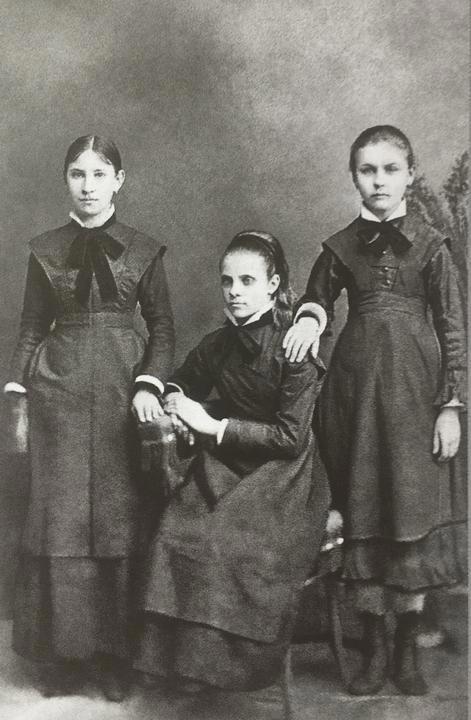 Три девочки в гимназических платьях с фартуками. Орел, 1880 год