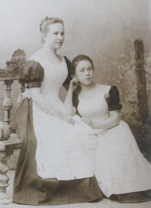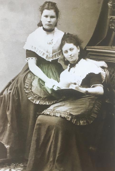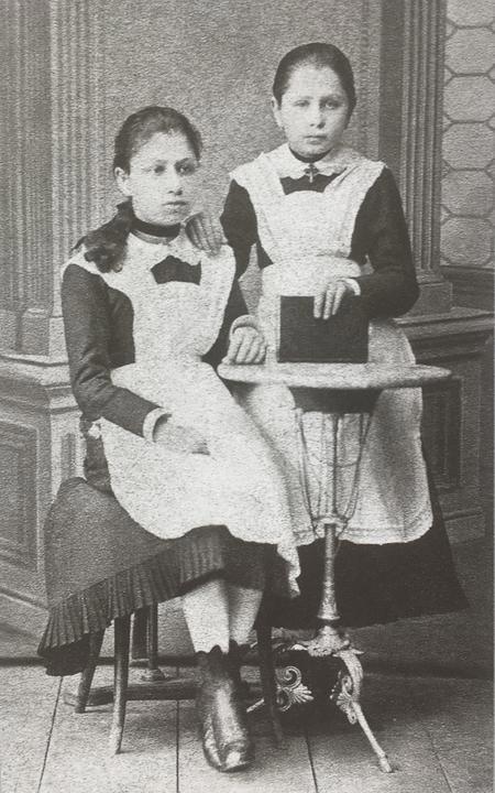 Две девочки в ученических платьях с отделкой плиссе и в белых фартуках, Минск, 1876 год