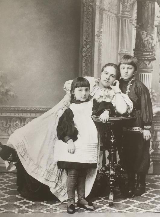 Брат с двумя сестрами. Старшая девочка в домашнем платье с отделкой оборками, младшая в гимназическом платье с фартуком. Мальчик в стилизованной косоворотке и панталонах, заправленных в высокие ботинки. Киев, 1890-е годы