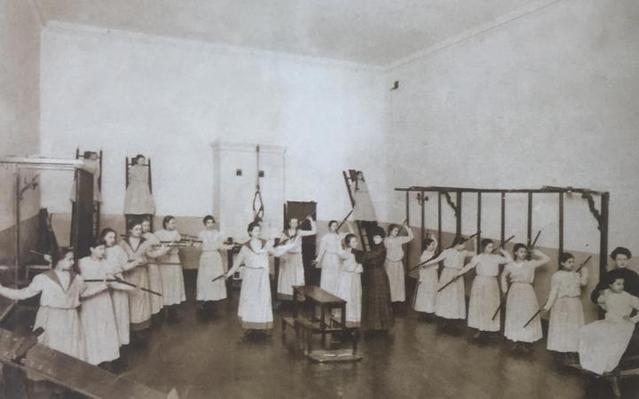 Воспитанницы Смольного института благородных девиц занимаются гимнастикой в матросках. 1910-е годы