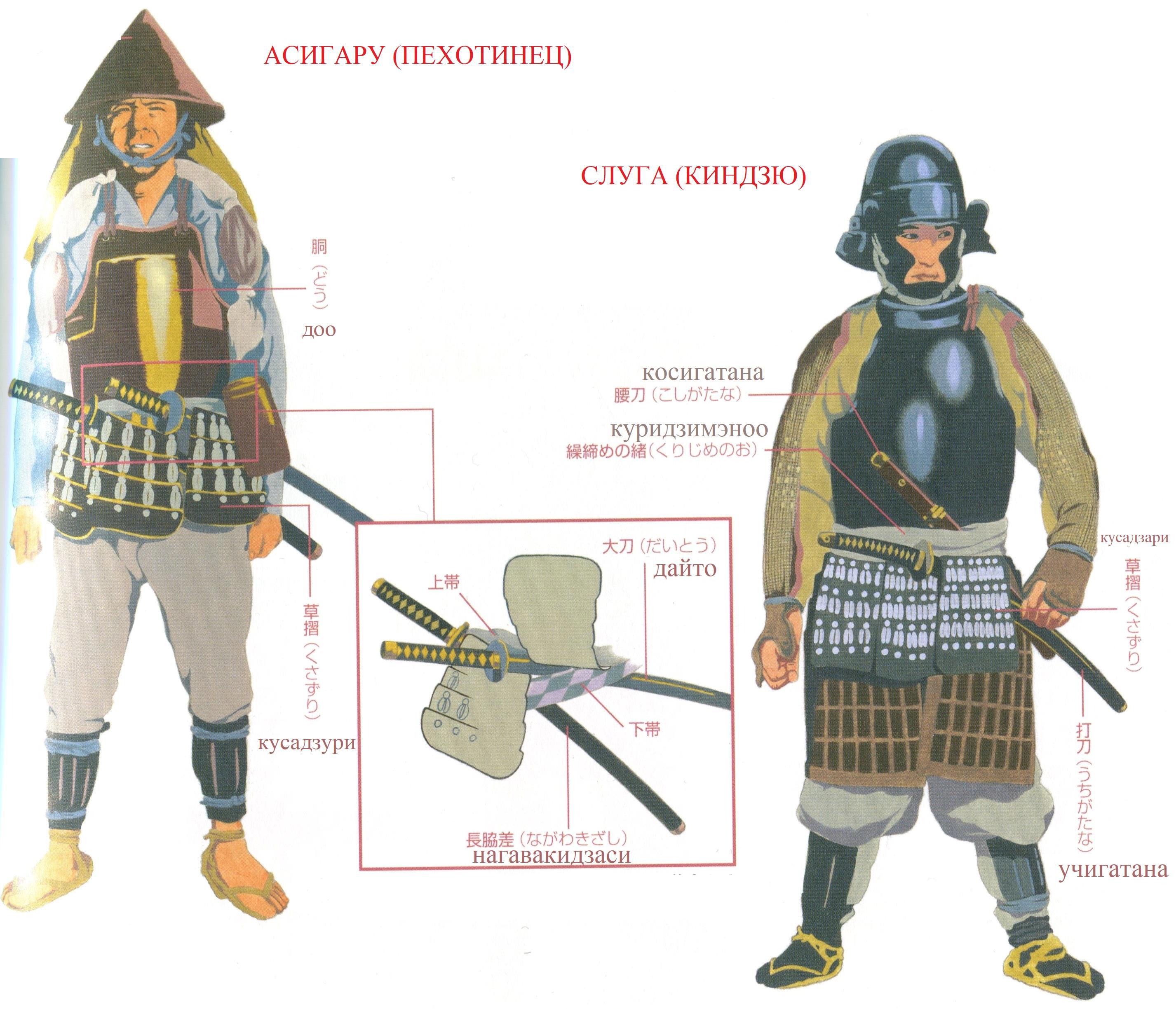Класс кинсю и класс асигару после периода Сэнгоку были оснащены доспехами и начиная с периода Сэнгоку владели большим (дайто, 大刀) и короткими (ко-гатана, 小刀) мечами.