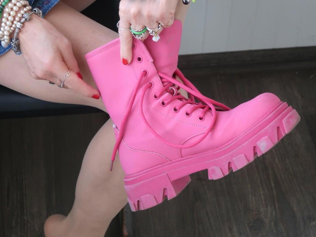 Утром, когда жена обувалась, увидел, что шов на её замечательных розовых военного стиля ботинках разошёлся.