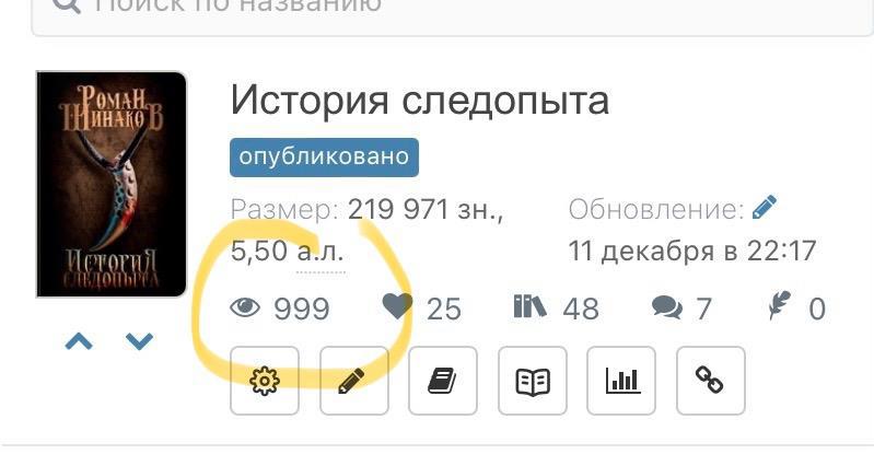 Автор: Роман МинаковДрузья! Часто встречаю посты про магию чисел, относящихся, как правило, к статистике произведения. Обычно у авторов это очень и очень солидные цифры, особенно касаемо библиотек. А сегодня заметил скромную магию и у себя. 999)))) Спасибо Вам, друзья, за интерес к моей книге. Вы лучшие!