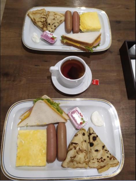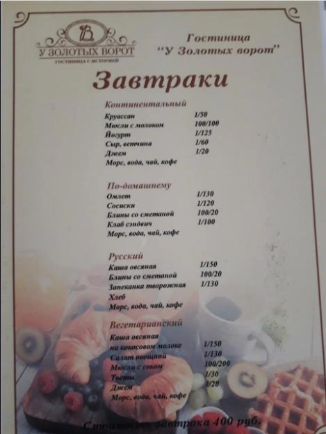 Там, в «едальне» «У Золотых ворот», нас уже ожидал в общем-то вполне сносный (и, главное, вангую, всеразмерно для здоровья полезный!) и очень даже неплохой на вкус, цвет, запах и кулинарную эстетику бизнес-ланч — «мелкооптовой» стоимостью аж 400 «Р» с рото-носа. Он, под эпичным (что-то сразу вспомнился бородатый анекдот про лес, грибника и медведя!) названием «Легкий Завтрак Туриста», включал в себя: сиротливую пару сосисок, Клаб-сэндвич с варенной колбасой, сыром и зеленым салатом, что-то там вроде желтушного цвета омлета, пластиковую миникоробчку с «джемом», две «треуголки» русских блинов со сметаной и, наконец, масенькую белую чашечку с чаем из пакетика «Lipton».