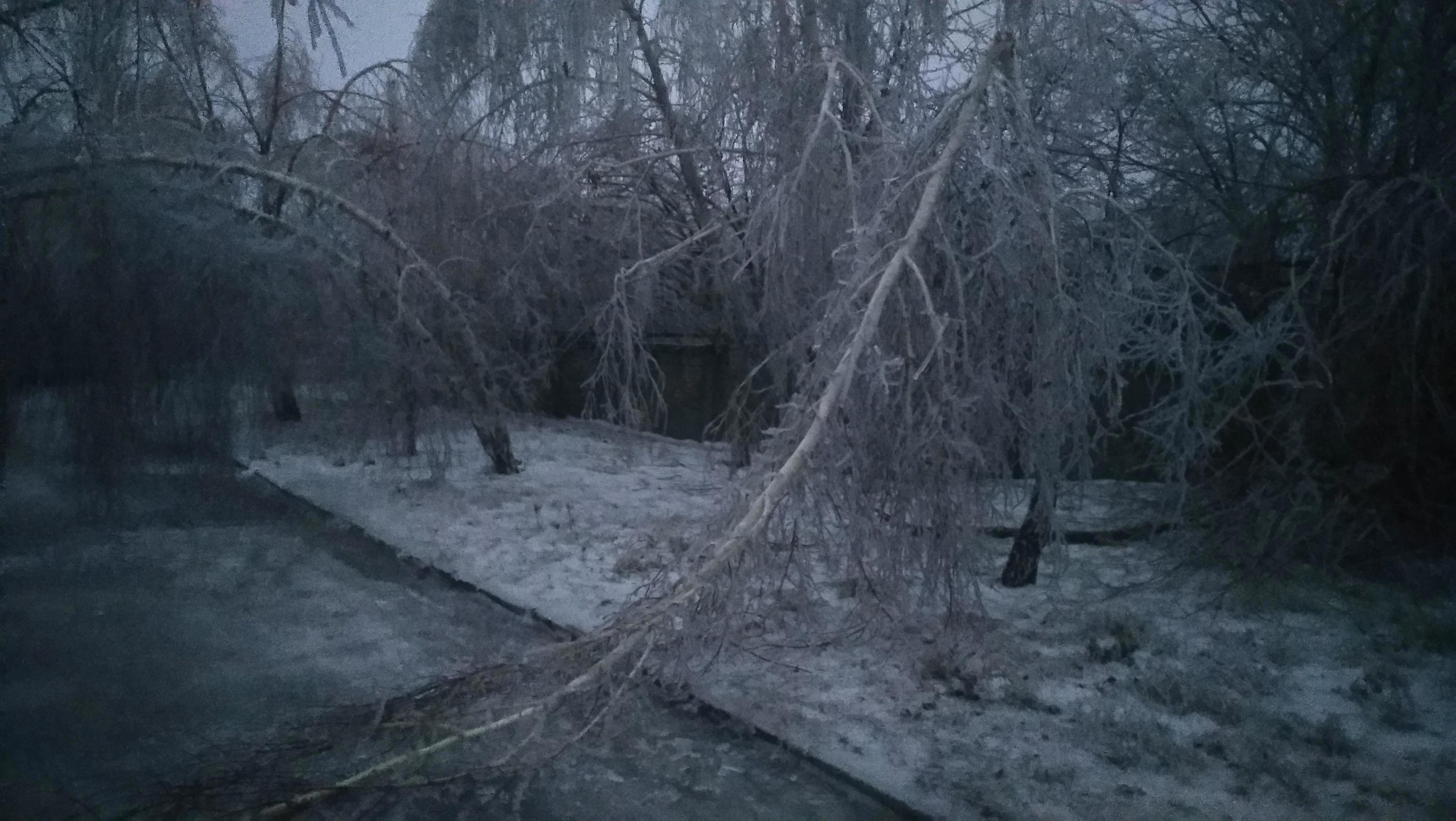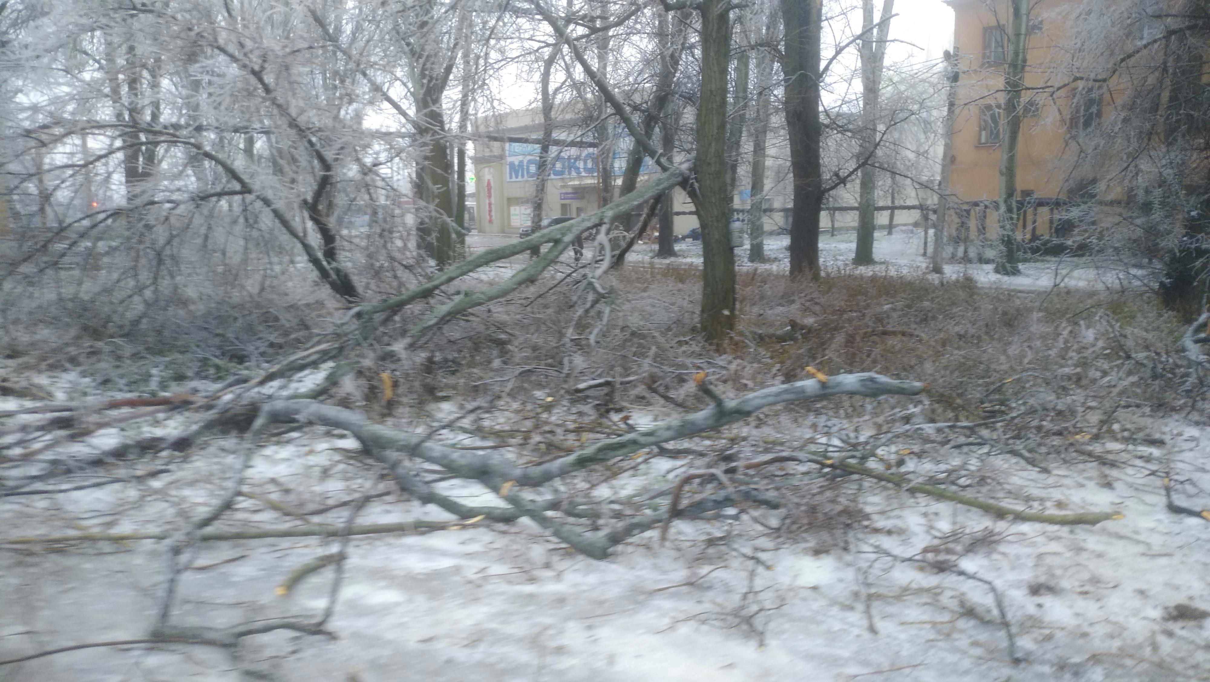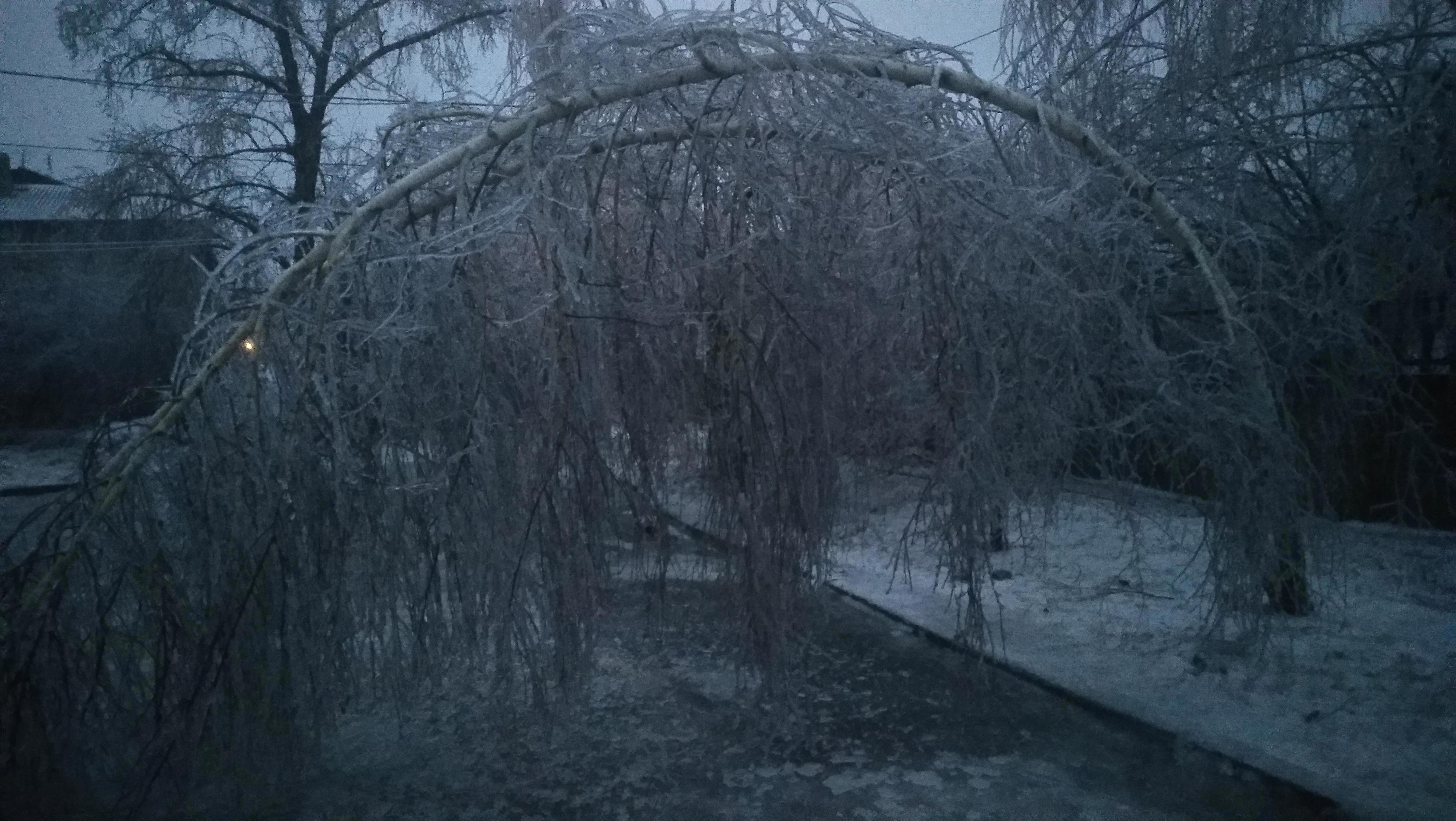 Хронология событий, - недели две назад было весьма тепло и погода была просто аномально тёплой для зимы, а потом хрясь похолодало и пошёл ледяной дождь, который заморозил деревья. И вот когда немного потеплело случилась трагедия, первая фотка эт у моего дома.