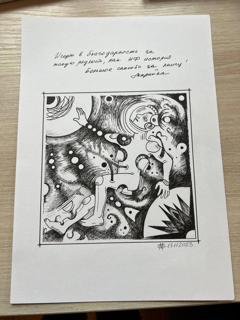Хочу сказать Марийке огромное спасибо! Держать настоящую иллюстрацию, нарисованную от руки к книге - очень вдохновляет. И вообще, оказалось, получать что-то по настоящей, а не электрической почте - это очень здорово. Особенно перед Новым Годом :)