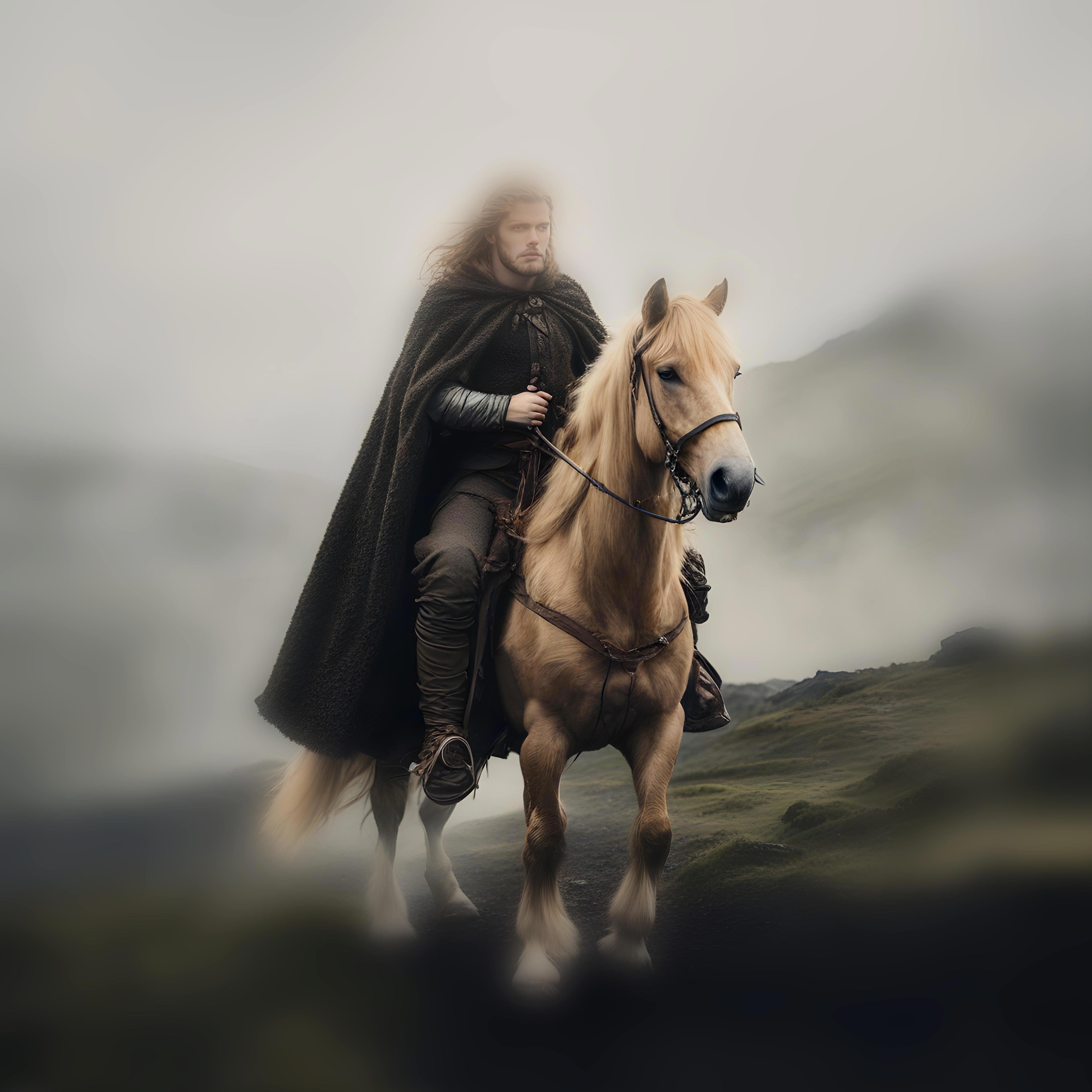 А это он же на лошади в тумане (заметьте, изображена лошадь исландской породы):