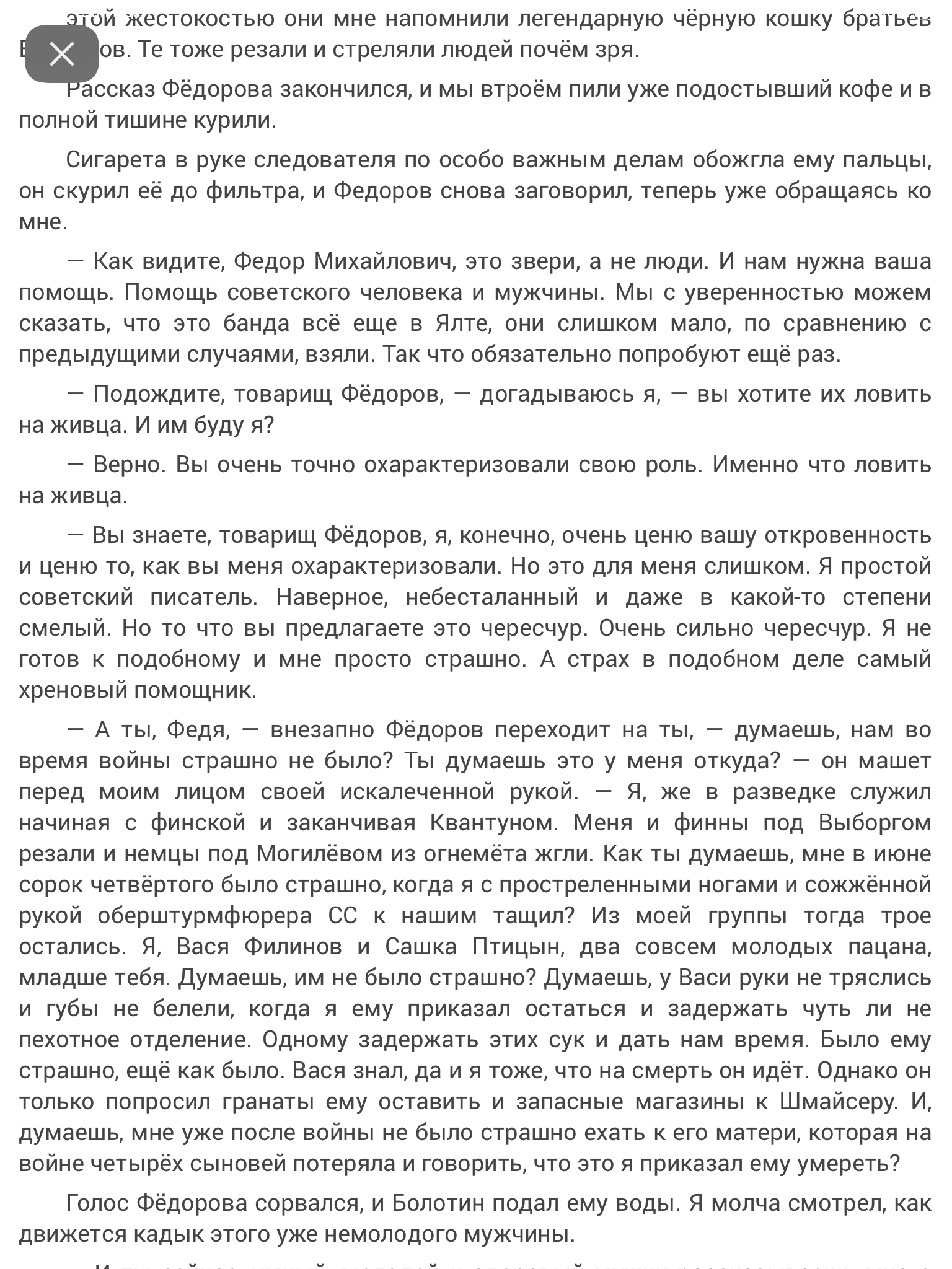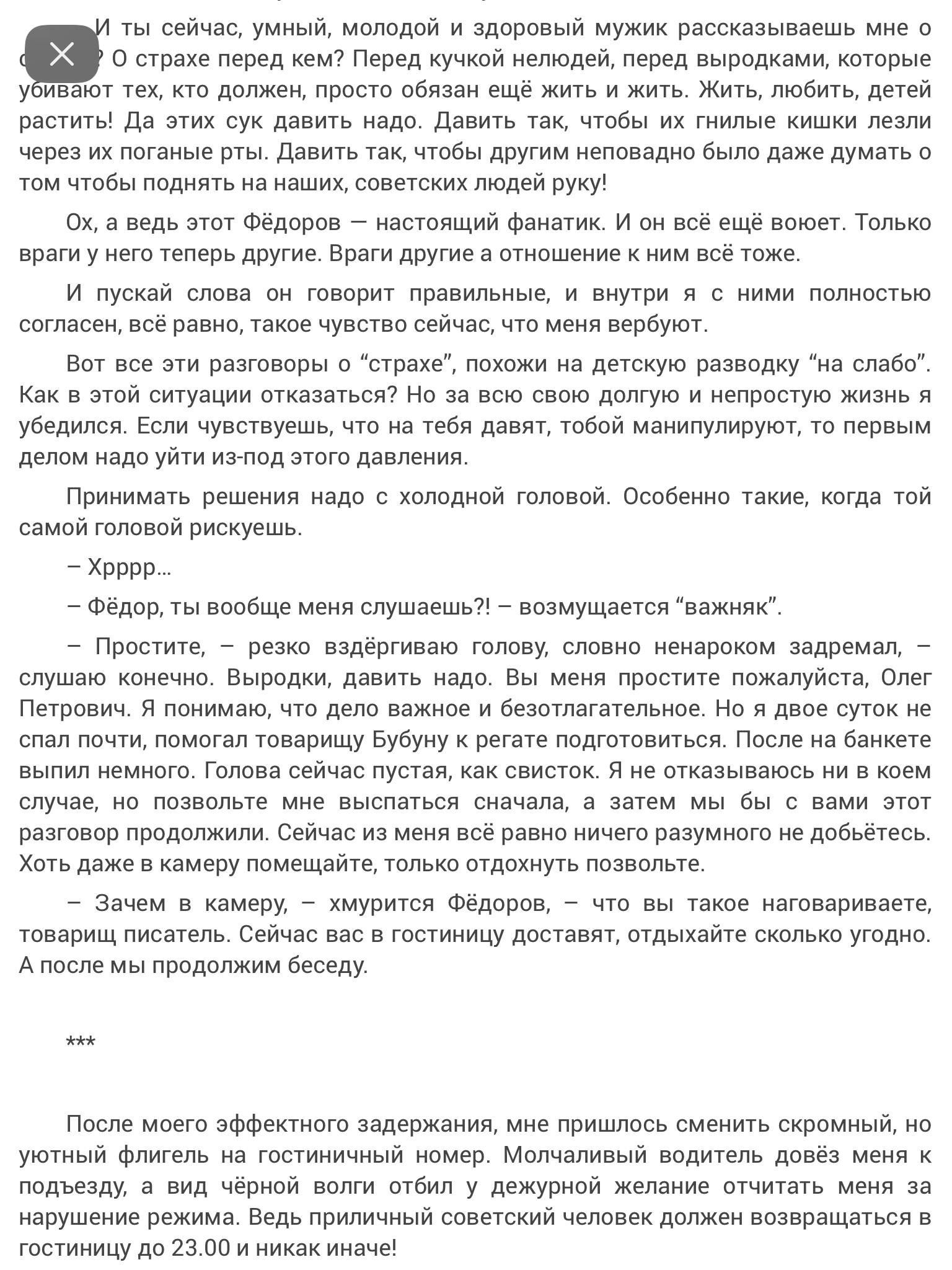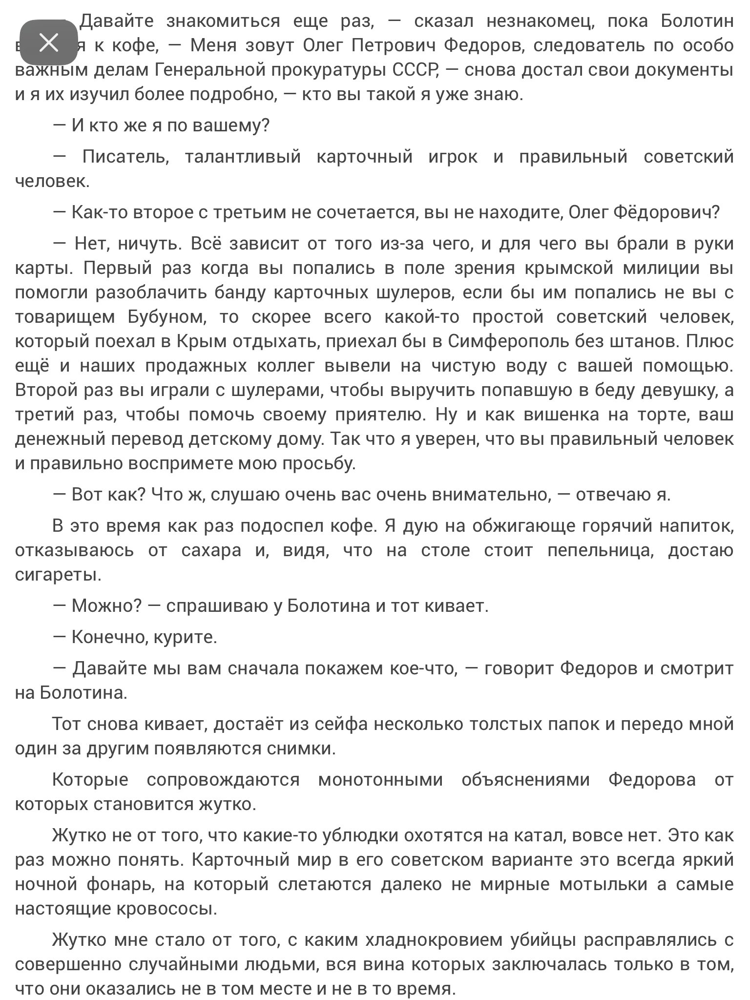 Токсик, уважаемый, Вы проект? Ну невозможно такое разное идеологически писать в разных книгах одного автора :( Вы себе не представляете уровень расстройства от Игрока 2 - может быть конечно потом выяснится, что убивали как раз оборотни в погонах, но что толку, внезапное кондовое "Следствие вели знатоки" в Игроке 2 вырубает наглухо, это же всё-таки не Курсант СССР и другая чепуха от ДиКо-образов :(