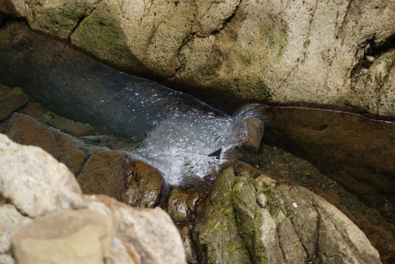 Утром надели согревающие рюкзаки и дёрнули по ручью вниз. По пути заметили, что вода странно реагирует с воздухом, выделяя белый налёт на камни и сероводород в атмосферу.