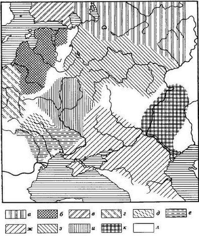 Буковками на ней обозначены следующие культуры: а – северные культуры с ямочно-гребенчатой керамикой; б – прибалтийская культура ладьевидных топоров; в – финская культура ладьевидных топоров; г, д – культура шаровидных амфор и шнуровой керамики; е – позднетрипольская культура; ж – катакомбная культура; з – фатьяновская культура; и – среднеднепровская культура; к – полтавкинская культура; л – неисследованные места.