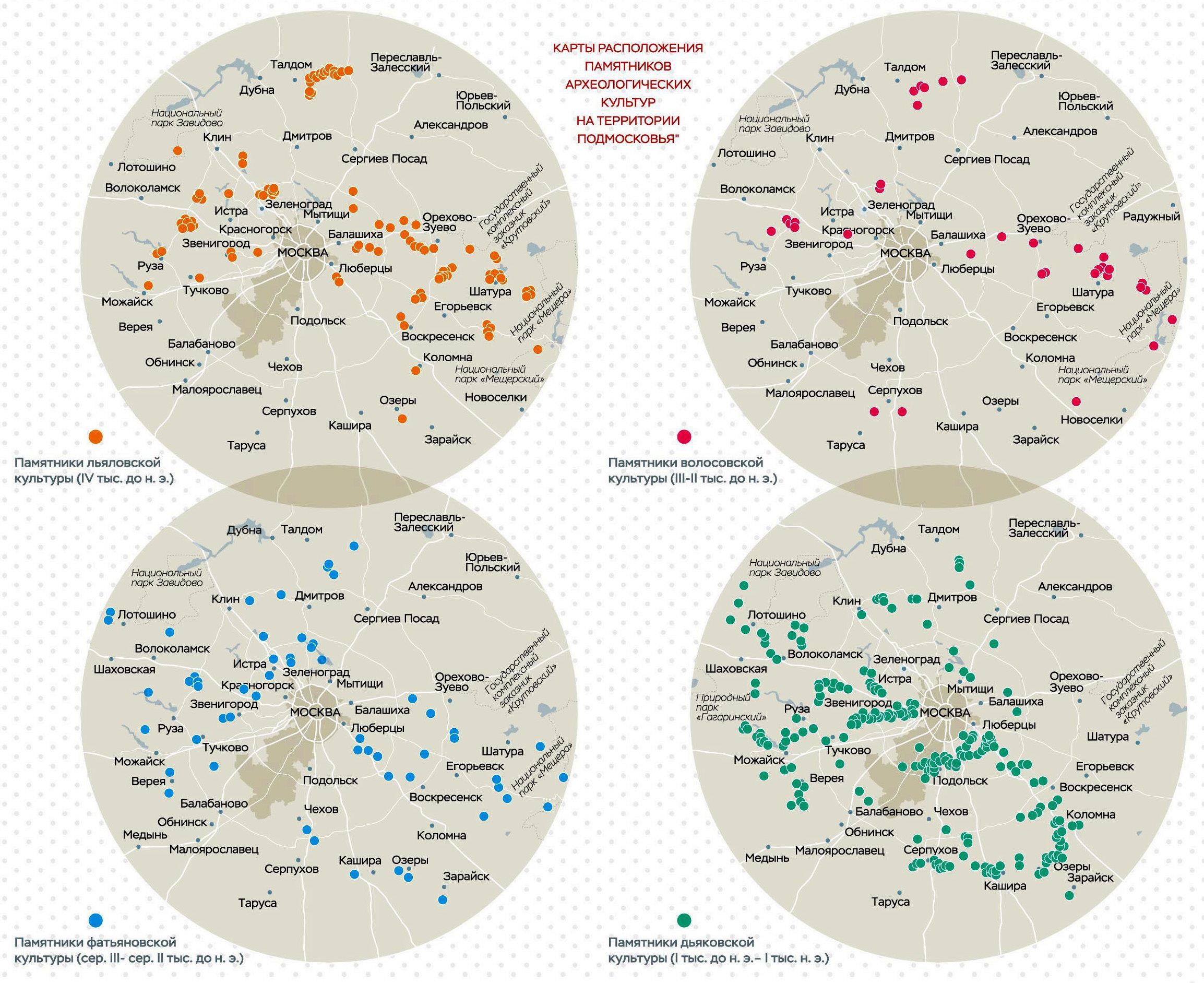 В далёком 1873 году нашёл один деятель под Ярославлем, около села Фатьянова два могильника с теми самыми сверлёными топорами и шнуровой керамикой (это на которой узоры делали, отпечатывая на сырой глине верёвочку). Подумали-подумали и порешили назвать это дело фатьяновской культурой. Потом были ещё находки и им тоже давали названия. Топоров тех и керамики набралось очень много и начали их раскладывать по полочкам и сличать – похожи или нет. Сейчас тех топоров наклассифицировали под полтора десятка, да ещё и с подтипами. Это ведь тогда мастер, который очередной топор делал, то думал, что изменял его немного, чтобы заказчику удобнее было, или просто чтобы не клепать одно и тоже. А сейчас их разделили на целые культуры. С горшками та же проблема. Но учёные были бы неучами, если бы не поняли, что топор – он и есть топор, несмотря на различия формы. Поэтому всех этих древних кучей стали называть культурами боевых топоров. Но у другие культуры тоже не забывали. Благо дело их ещё и по времени разложили, как смогли, хотя сейчас признают, что с датировкой есть проблемы. А чтобы не запутаться и другим как-то это всё пояснить, рисуют вот такие карты с местами находок разных культур. Кстати, глядя на эти схемы не скажешь, что находки следов фатьяновцев в Подмосковье такая уж редкая редкость – следов волосовцев, например, куда меньше: