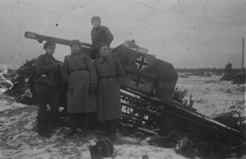 Военнослужащие 249-й «эстонской» дивизии рядом с немецкой САУ на базе советского танка Т-26, подбитой в ночном бою под Техумарди, на острове Сааремаа (Эстония). 1944 г.