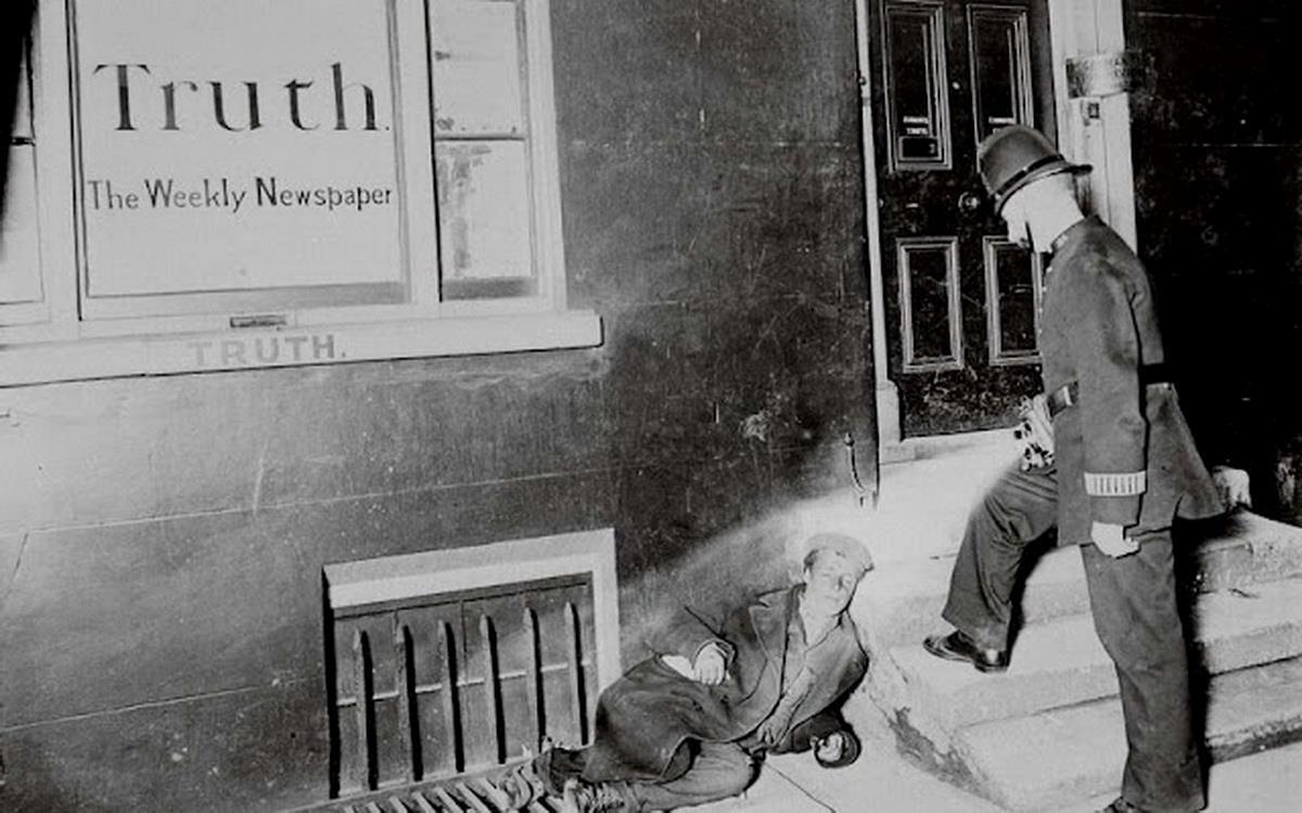 Полицейский светит фонарем в лицо бездомному в Ист-Энде