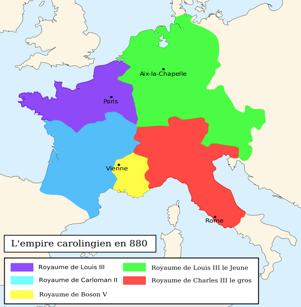 Разумеется, Бозон был далеко не единственным желающим влиять на политику юного короля. Знать угрожала расколоться на два лагеря, и от этого раскола вряд ли кто-либо выиграл. Бозон и Бернар не стали цепляться за безраздельную власть и отступили: Нейстрию и Западную Франкию получил Людовик, а вот Бургундия и Аквитания достались его младшему брату Карломану. Соответствующий договор подписали в 880 году в Амьене.