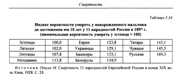 Как можно видеть, у разных народов/конфессий, живших в одинаковых условиях, были разные стратегии размножения. Можно было иметь меньше детей (за счет чего можно было избежать дикой детской смертности, и дать детям образование). А можно было плодится на пределе биологических возможностей, иметь чудовищную детскую (и женскую) смертность, а выживших детей использовать как рабочую силу, совершенно не заботясь об образовании. Дети при этом вырастали, как некие "Маугли" с сильно недоразвитым интеллектом, но для традиционного общинного хозяйства интеллект и не требовался. К сожалению всякие народники и революционные демократы этого видеть не желали, но сочиняли сказки про злых помещиков, малоземелье, большие налоги, и тому подобную ерунду.