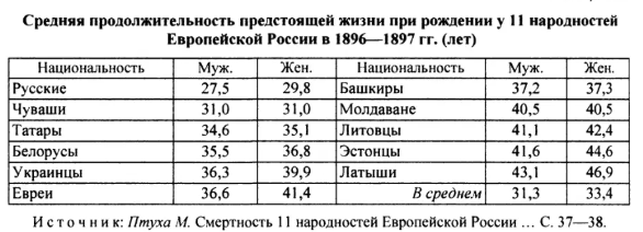 Среди православного, и в особенности среди русского населения...существовала самая расточительная, неэффективная экстенсивная модель воспроизводства населения. Среднее число девочек, которое надо было родить замужней женщине, чтобы обеспечить простую замену материнского поколения (так называемая цена простого воспроизводства населения), в середине XIX в. равнялось 2,4, а в западноевропейских странах в XVII-XVIII вв. — 1,8. Причина такого различия заключается в том, что у православных женщин до середины XIX в. существовала иная психологическая установка в отношении числа рождающихся и умирающих детей — полагаться не на себя, а на судьбу. Вся забота нашего крестьянина о детях в раннем возрасте яснее всего выражается в его поговорке: «Если ребенок родился на живое, то выживет, если на мертвое, так умрет». Уход за детьми, даже за первенцами, был минимальным. Среди 11 народностей России в конце XIX в. смертность детей у русских в возрасте до 3 лет включительно была наивысшей — выше, чем у белорусов, украинцев, молдаван, татар, башкир и чувашей, которые в смысле материального достатка и образования даже уступали русским"