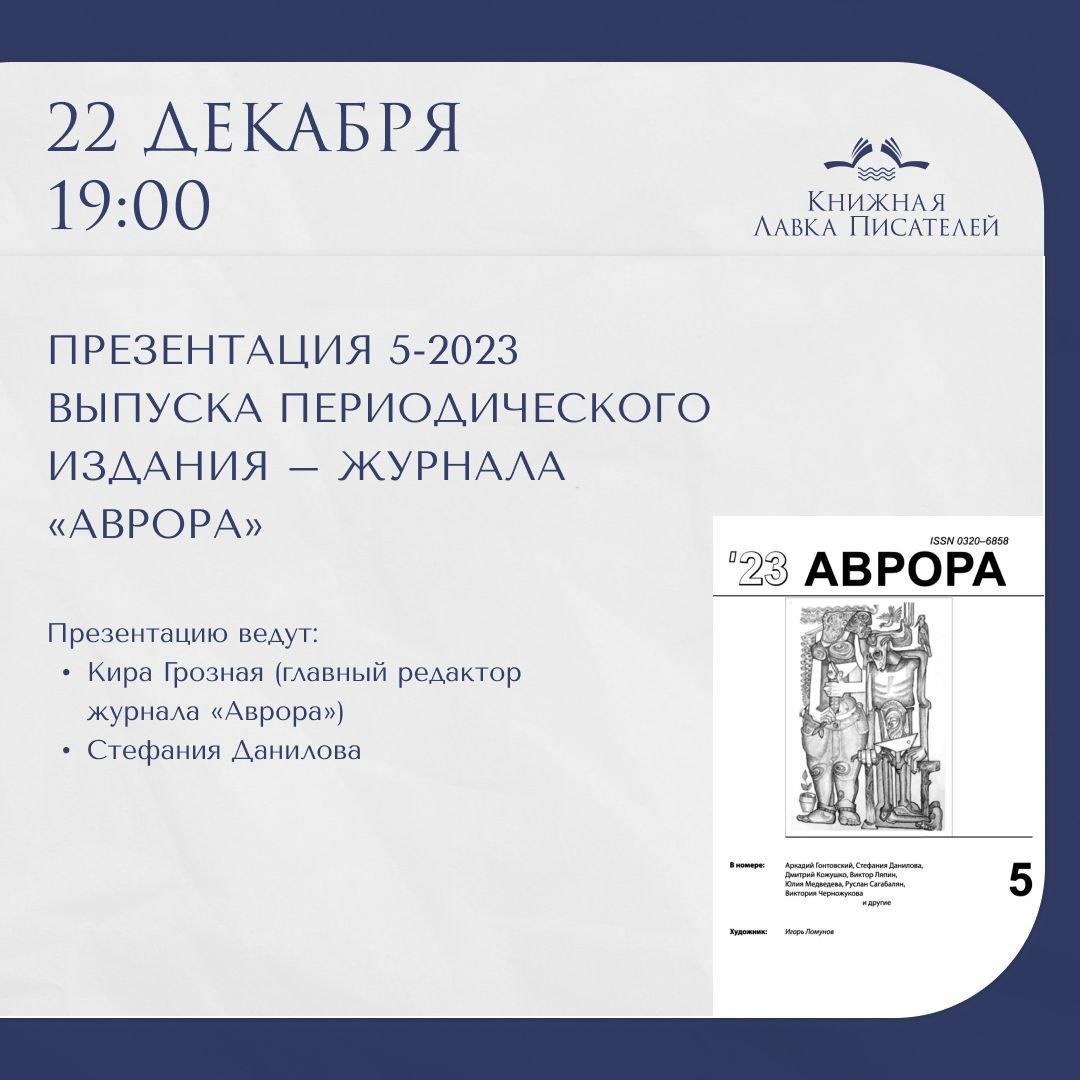 Контекст: в эту пятницу, 22 декабря 2023 года, в 19:00 в Книжной Лавке Писателей (СПб, Невский пр., д. 66) состоится презентация журнала "Аврора", выпуск N5/2023, на которой выступают авторы выпуска, и я в том числе.
