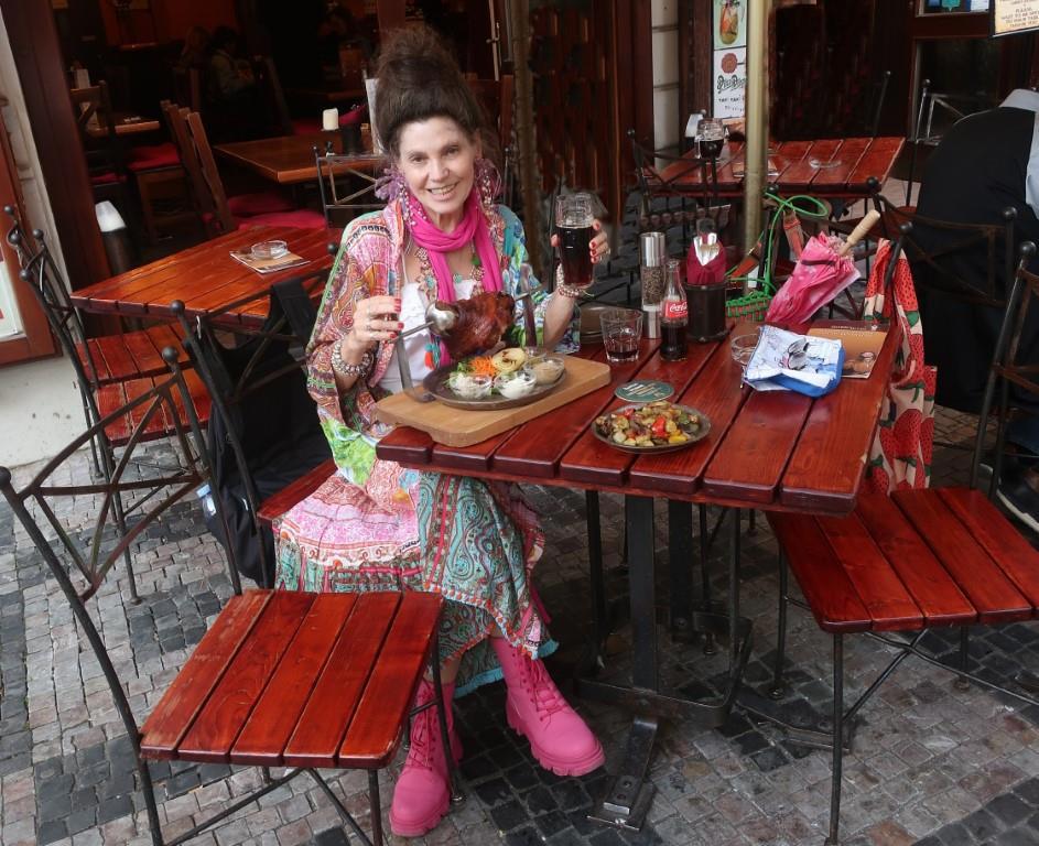 В ресторан, где “вепрево колено” весит 1.8 кг, нам не попасть, как и в кафе, в котором пиво развозится паровозиками - оба они сегодня выходные, а пойдём мы во второе по оценкам и размеру свиной рульки - ресторан-кафе “У Святого Вацлава”, где рулька "только" 1.3 кг.