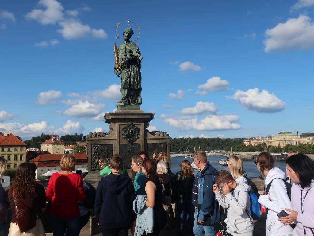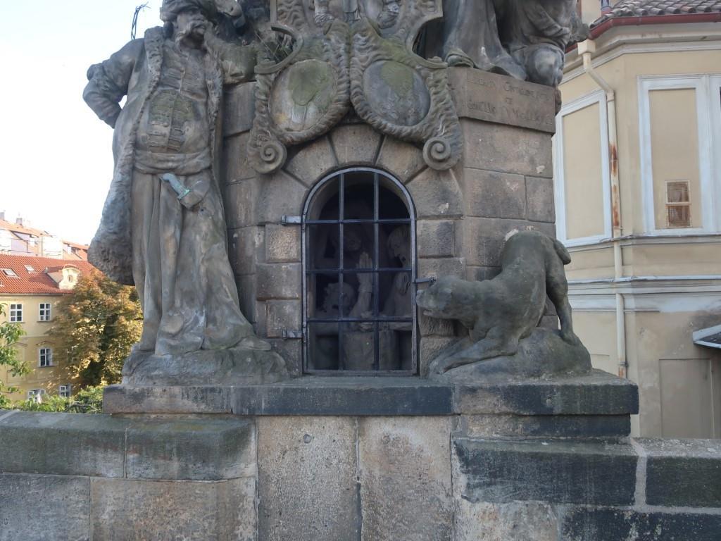 Первое из них — самое знаменитое изваяние — статуя святого Яна Непомуцкого, придворного священника короля Вацлава IV. На барельефах у подножия статуи изображена трагическая история смерти святого. Легенда гласит: однажды монарх приказал священнику рассказать всё, в чём признавалась на исповеди королева, так как подозревал ее в измене. Ян Непомуцкий не нарушил обета и не раскрыл тайну исповеди даже под пытками. Полуживого, его положили в мешок и сбросили с моста во Влтаву — эта сцена изображена на барельефе. Считается, что нужно загадать желание и потереть фигурку летящего в воду мученика — тогда все сбудется.