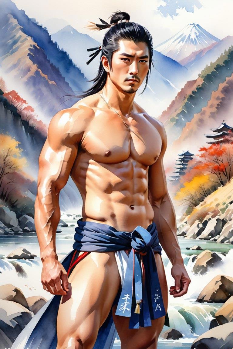 Голый японский мужчина, мускулистый, традиционные одежды, голая грудь, на фоне гор и реки, конский хвост, суровый