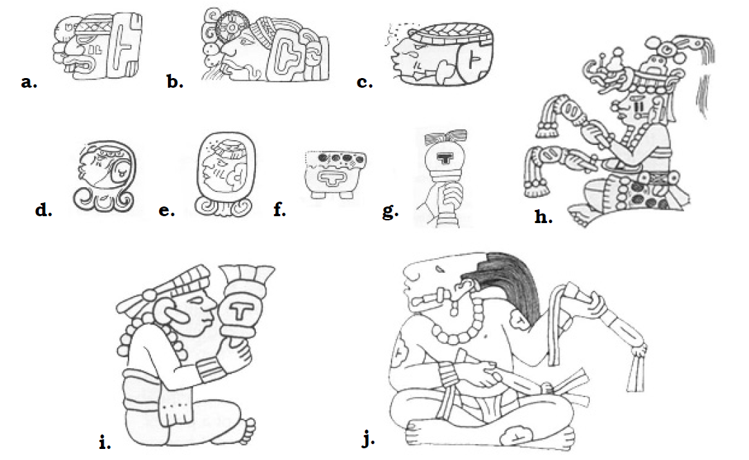 Изображения бога Н. a) Раннеклассический иероглиф бога ветра со стелы 31 из Тикаля. b) Бог-покровитель месяца Мак с панели из Бонампака. с) Позднеклассический бог ветра. Деталь с резной кости из захоронения 116 в Тикале. d-e) Изображение бога ветра в качестве иероглиф дня Ик из Паленке. f) Барабан со знаком Ик, деталь раннеклассической вазы. g) Погремушка со знаком Ик, деталь скульптуры из храма 11 Копана. h) Бог ветра. Деталь раннеклассической курильницы. i) Персонифицированная форма числа 3 – деталь текста на резной скамье из Копана. j) Покровитель месяца Мак с палетки из дворца Паленке. Обратите внимание на Т-образные символы.