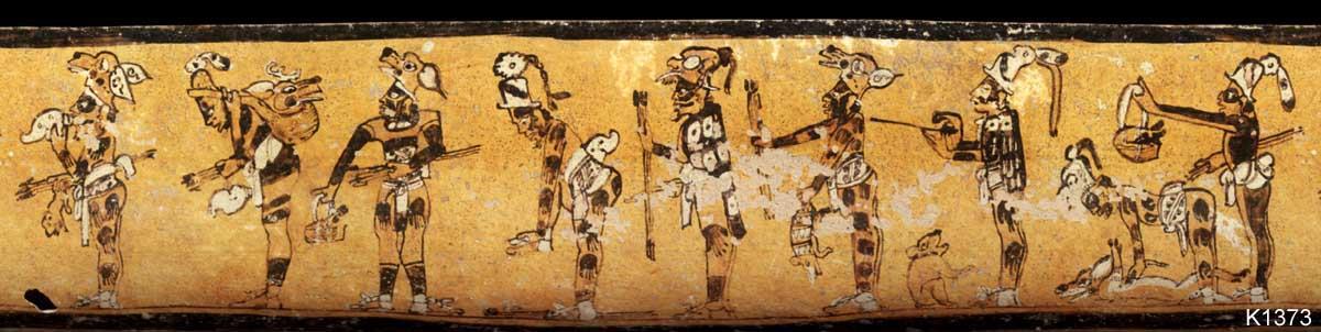 Обнажённый бог охоты или его имперсонатор дует в раковину. Рядом сидит обнаженный пленник. Перед богом чаша с головой принесённого в жертву человека. Обратите внимание на полосатую маскировочную окраску.