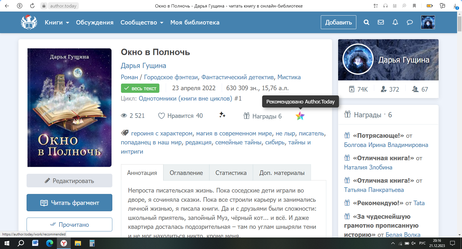 Роман «Окно в Полночь» прошёл отбор в виджет «Рекомендовано АТ», ура)