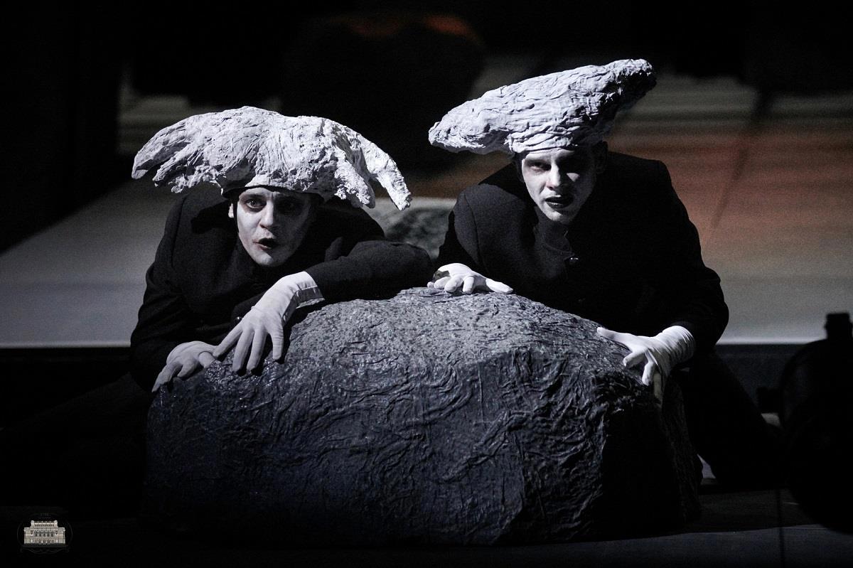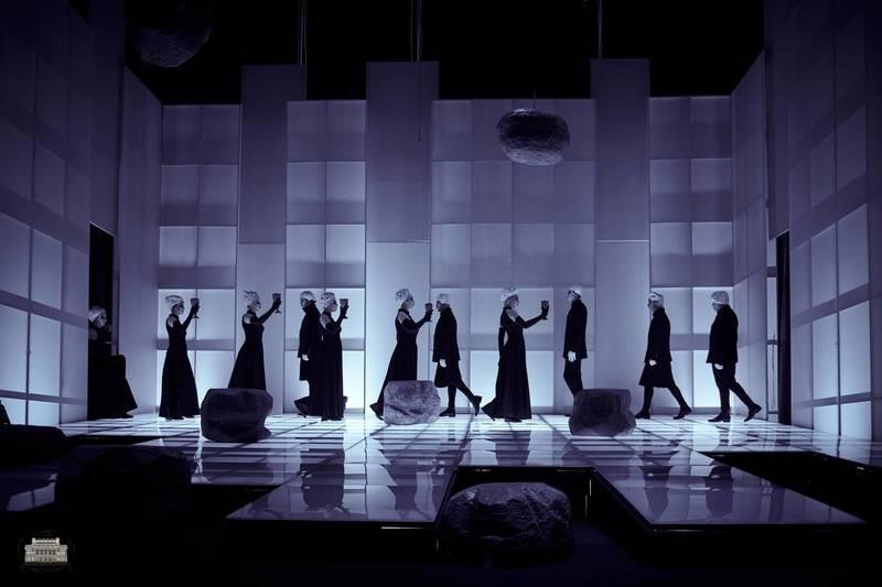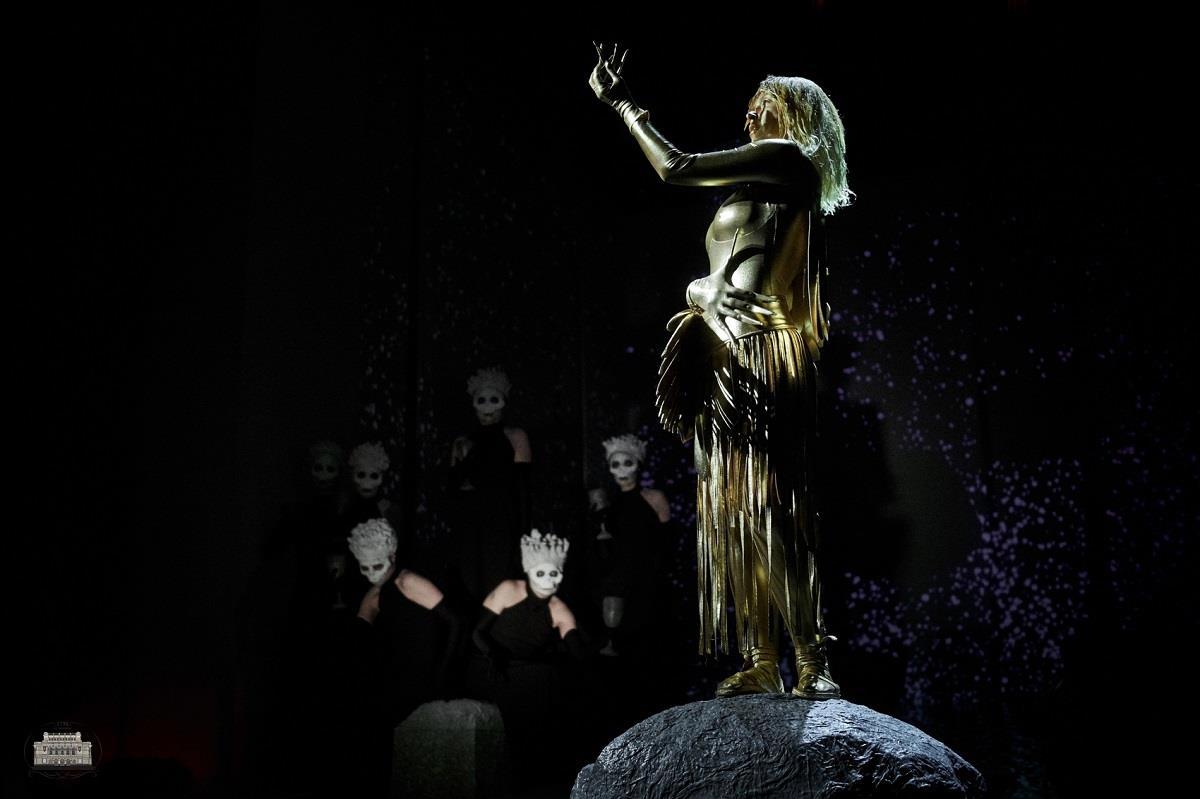 Все герои - с белилами на лице и с обведёнными черным глазами. Все одеты в одинаковые черные костюмы: и короли, и солдаты-офицеры, и убийцы, и малолетний сын Макдуфа, и ведьмы. Выделяется, впрочем, Геката - богиня тьмы и колдовства, она в золотом одеянии и с крылом (одним). Артистка Вероника Блохина, играющая Гекату, по-моему, ужасно переигрывает: говорит слишком уж замогильным голосом с реверберацией.
