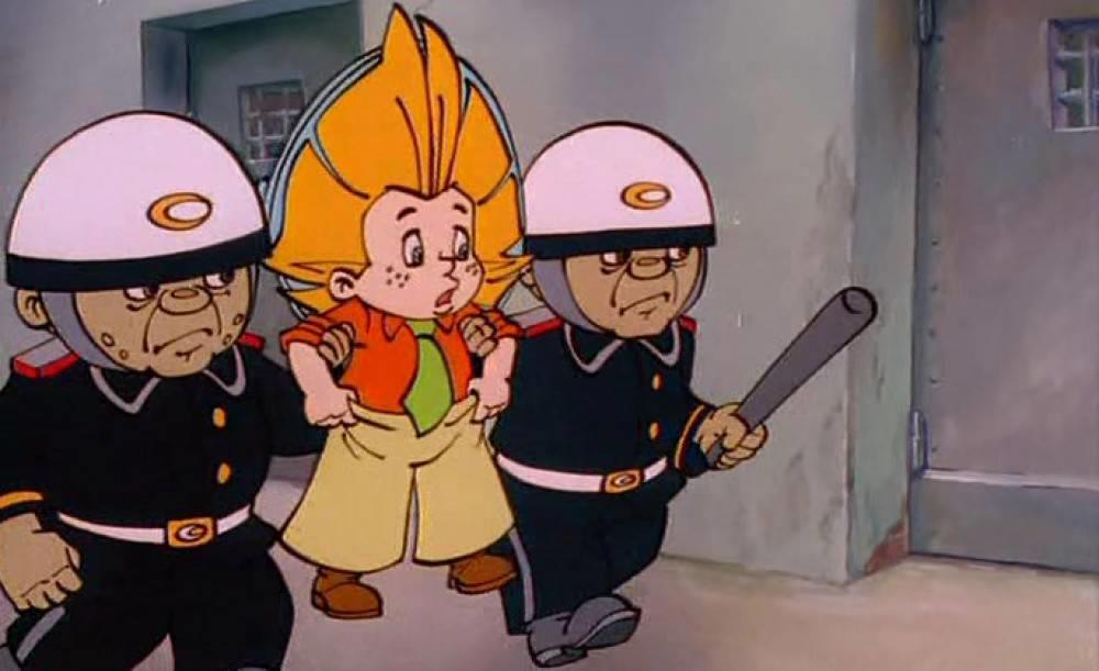 Не зная что такое деньги, Незнайка начинает свои первые шаги в лунном обществе с того что ест в чужом саду малину. За что получает метлой по голове, а потом хозяин натравливает на него собак. Удрав от собак и оправившись от первого шока, Незнайка почувствовав голод, садится за столик в уличном кафе и заказывает еду. Поев, он уходит не заплатив. Официант вызывает полицию. Незнайку бьют дубинкой, а потом садят в тюрьму.
