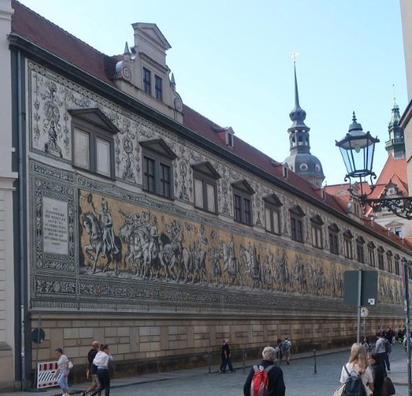 2300 фарфоровых плиток Мейсенского фарфора (общая длина 100 м) выложили для мозаики Процессии Принцев в честь 800-летия правящего дома - это самая большая в мире настенная картина из плиток, изображающая 34 маркграфа, герцога, курфюрста и короля из династии княжеского дома Веттинов, правивших Саксонией между 1127 и 1904 годами. На самом деле их 35, но почему одного из нарисованных считать не надо, я не до конца понял.