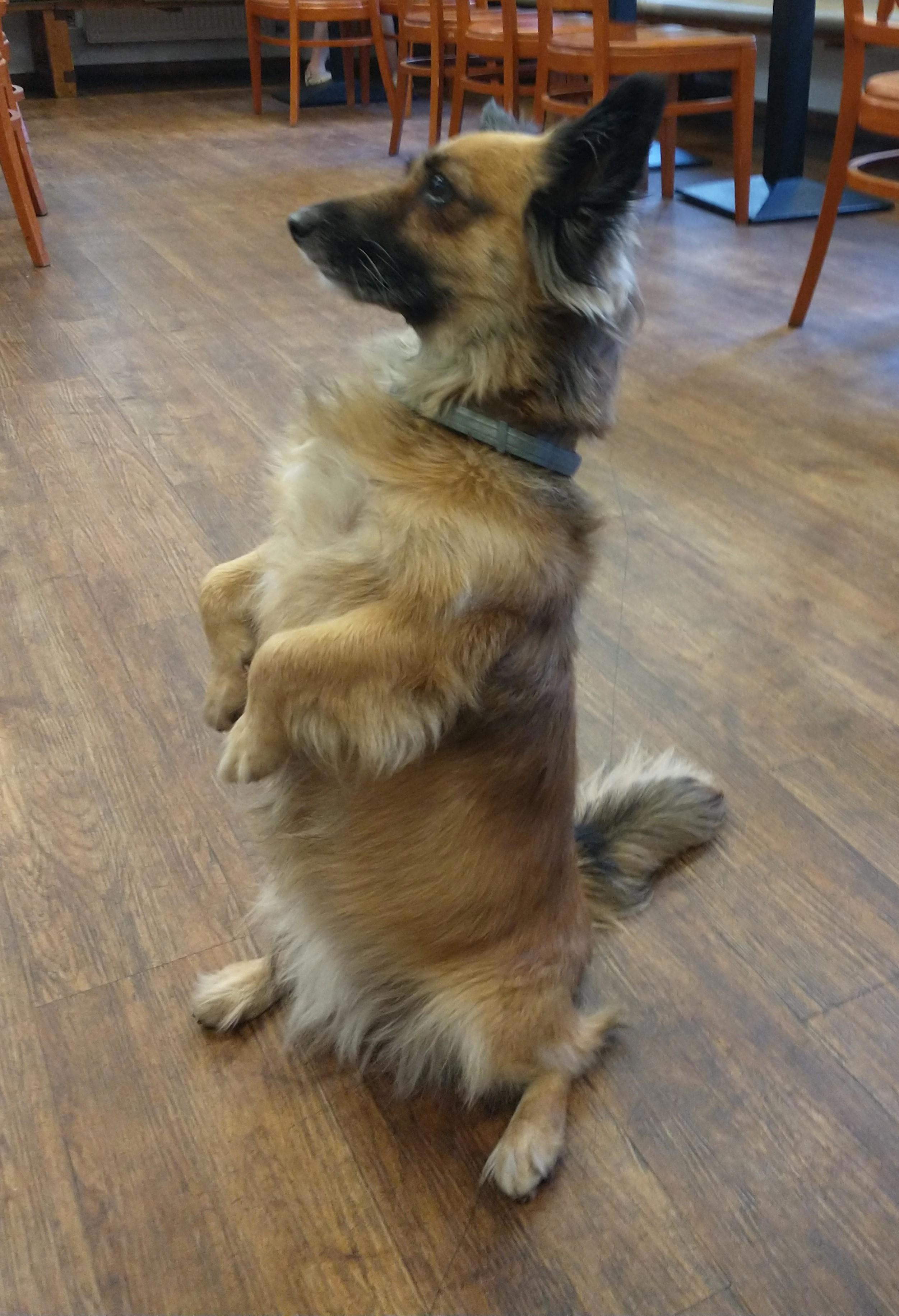 На завтраке встретили замечательную собачку. Как утверждали её хозяева, так стоять её никто не учил, но однажды заняв такую позицию, которую окружающие встретили с восторгом, теперь постоянно так становится и ожидает похвал.