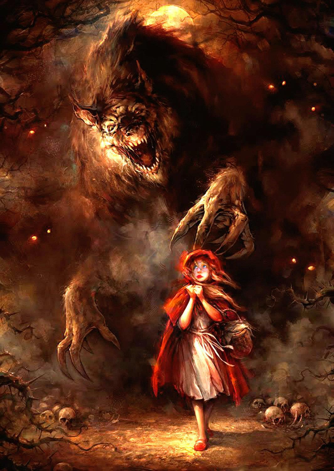 Красная Шапочка. Перро создал версию сказки "Красная шапочка" в 1697г. Волк, переодетый в бабушку, которую он недавно проглотил, был оборотнем. Он предлагает Красной шапочке раздеться и присоединится к нему в постели, выбросив одежду в огонь. По одному источнику волк съедает девочку, когда она оказывается у него в постели, и сказка на этом заканчивается. По другой Красная шапочка говорит волку, что ей нужно в туалет и ей не хочется делать "это" в постели, после чего девочке удается убежать. Возможно, это более позитивный конец сказки, чем в версии Перро, когда девочку съедает волк, или первой версии братьев Гримм 1812 года, по которой дровосек освобождает ее и ее бабушку, разрезав живот волка.