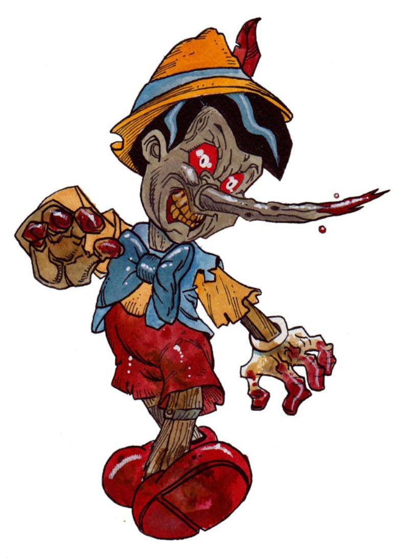 Пиноккио. В исходной сказке, которая пришла из глубины веков, впервые написанной Карло Коллоди, и опубликованной в 1883 году, Пиноккио засыпает перед камином, и его ножки сгорают, а перед этим он убивает деревянным молотком говорящего сверчка, который его вздумал поучать. После этого Пиноккио превращают в осла. Покупатель покупает Пиноккио в виде осла для того, чтобы сделать из его шкуры барабан. На протяжении всей истории его преследуют, всячески издеваются над ним и сажают в тюрьму. Наконец привязывают к камню и бросают в пропасть.