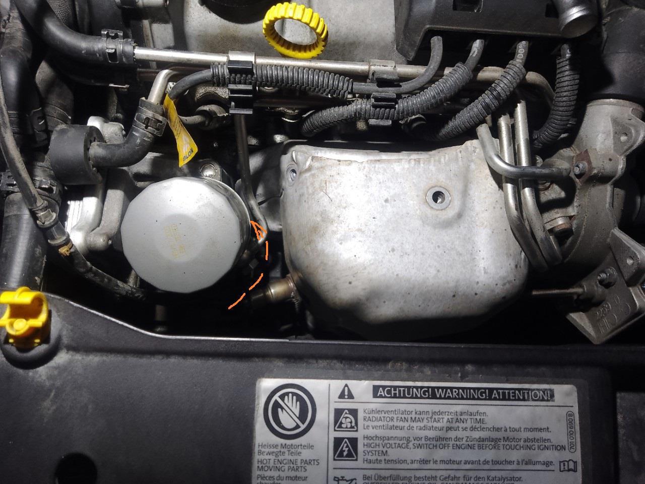 При этом полностью слить охлаждение с этого ведра нет возможности. Нет кранов! Есть другие версии, у которых есть краник на радиаторе, у этого и того нет! Вот и виновник торжества: с абсолютно плосским резиновым уплотнителем, который больше ничего не уплотняет. Стрелкой отмечена трубочка, которая отводит ОЖ от радиатора теплообменника в блок.