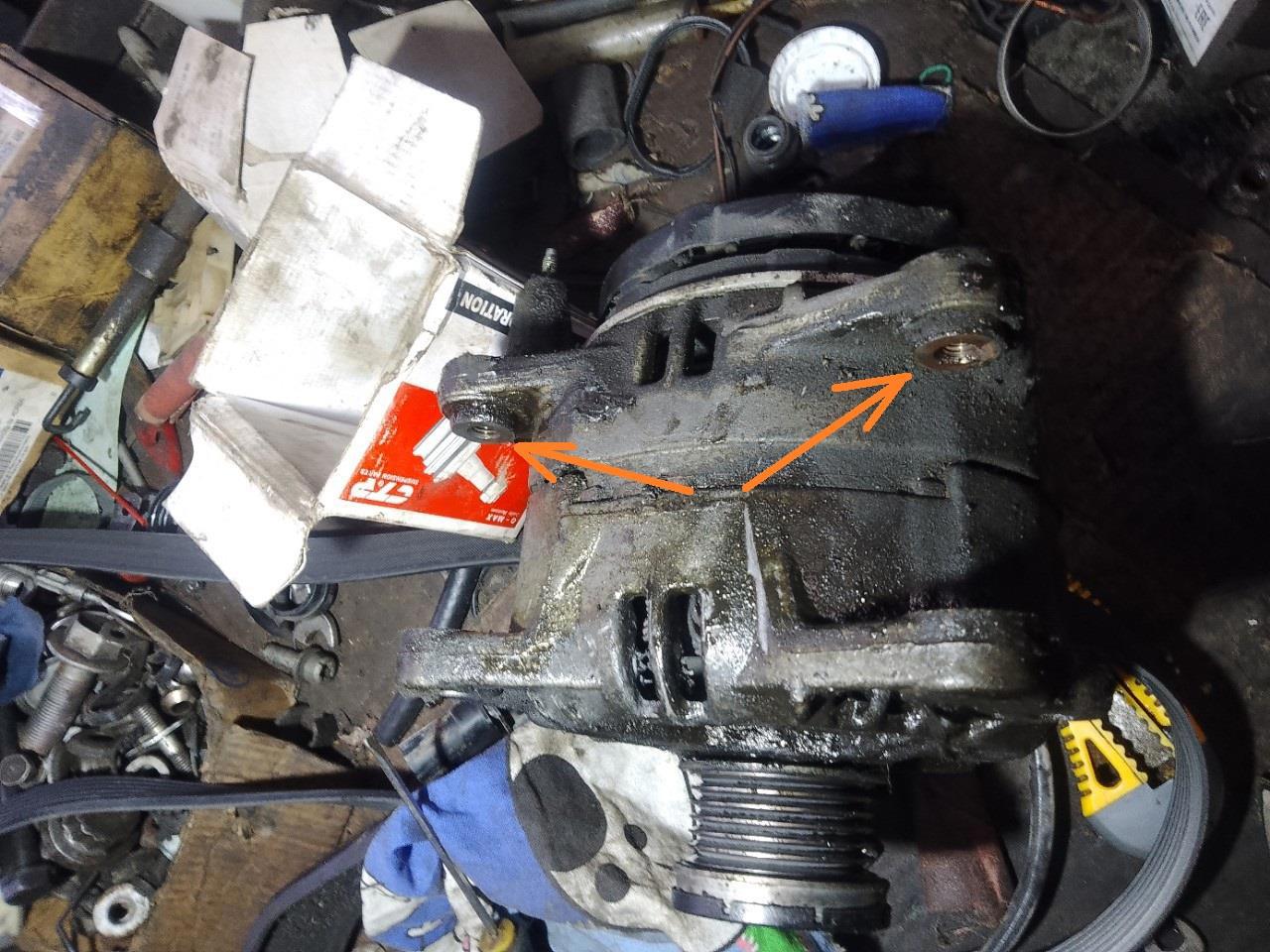 Оба уха генератора имеют подвижную муфту, которая надежно пришпиливает его при затягивании болтов, поэому сниматься он не хотел. Очень сильно не хотел. Но монтировка и грубая сила его переубедили.