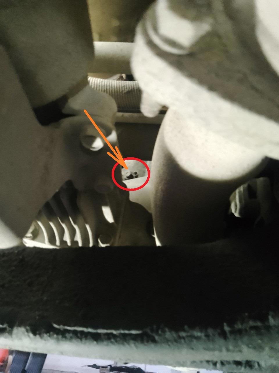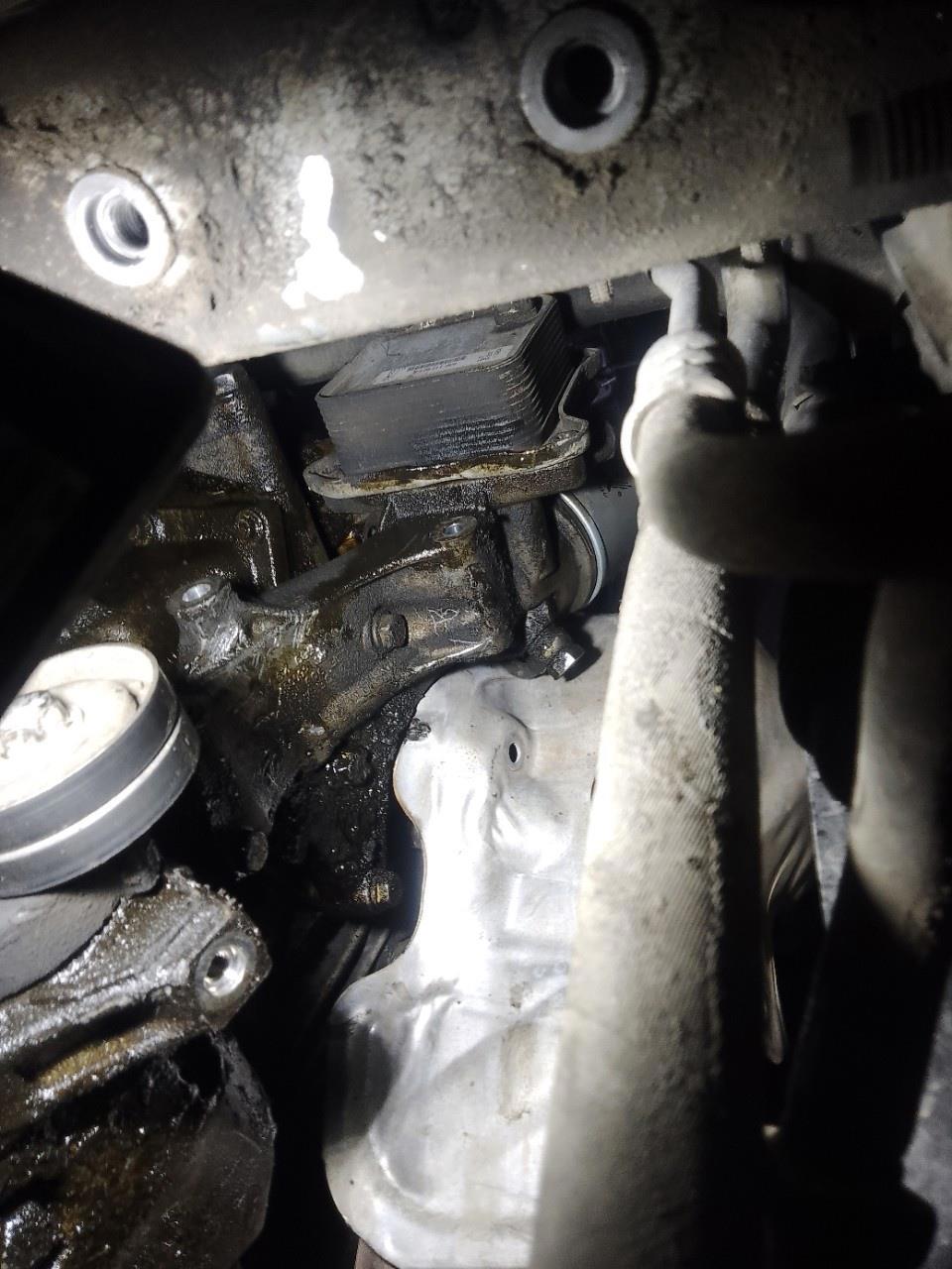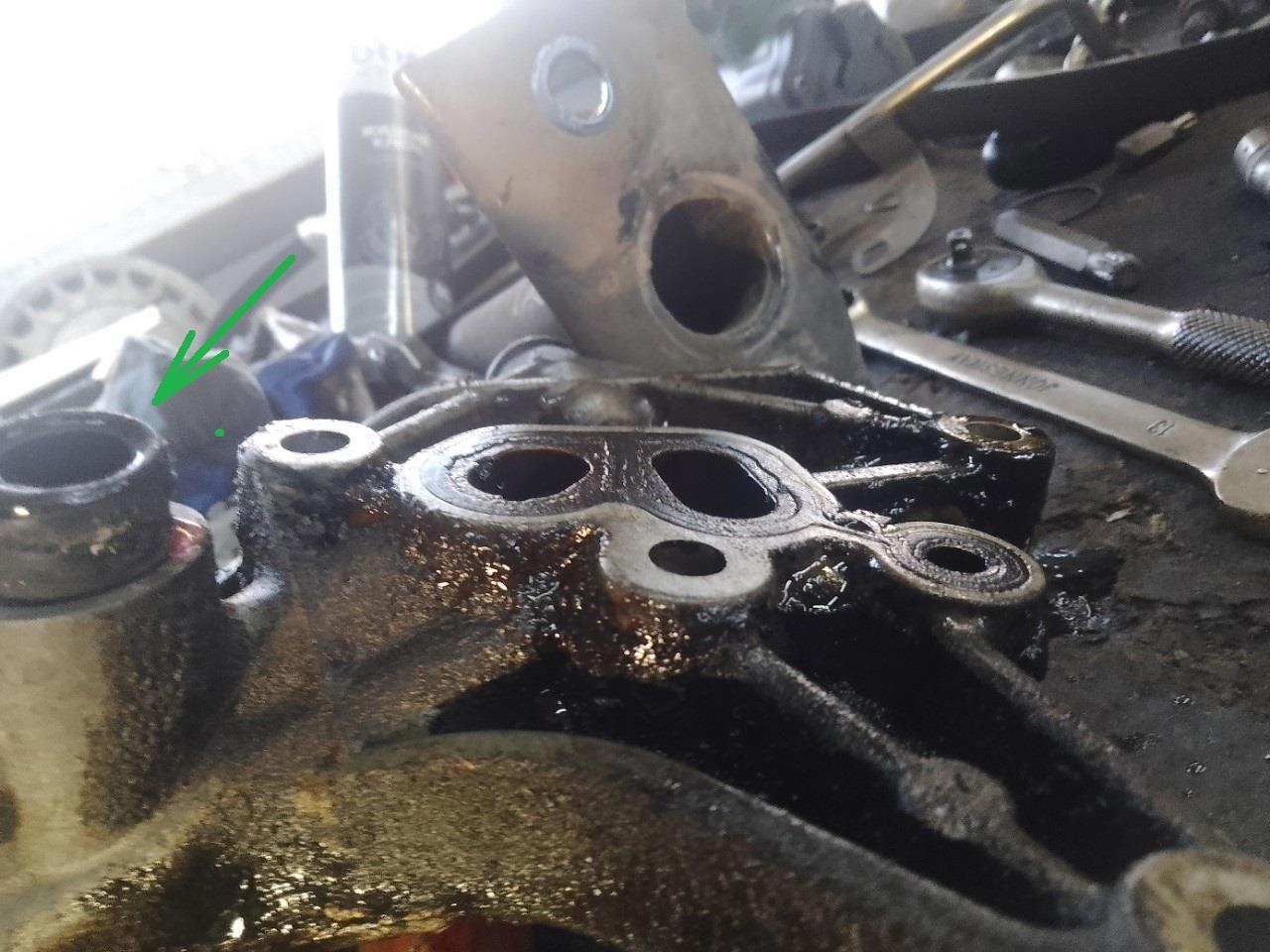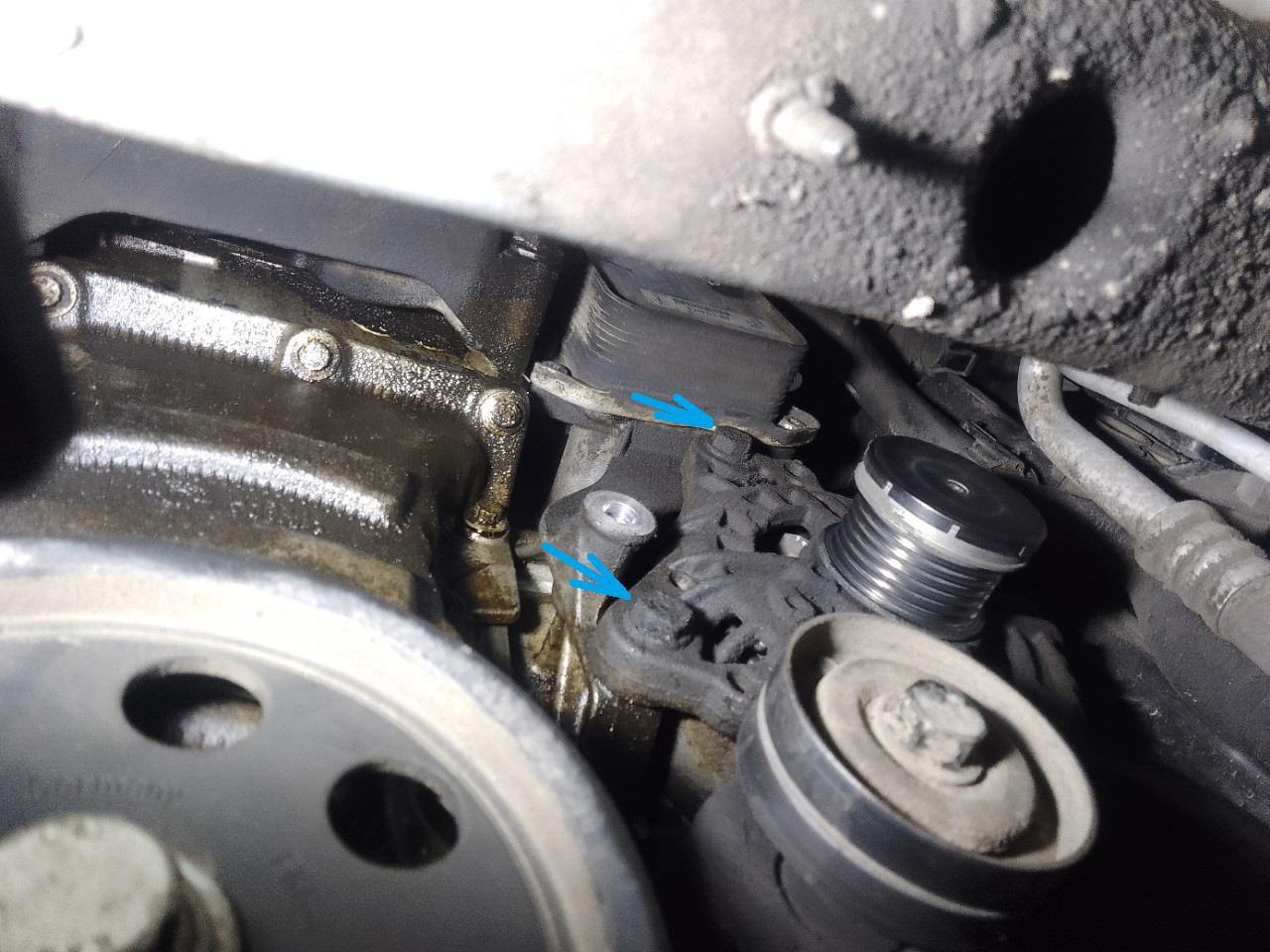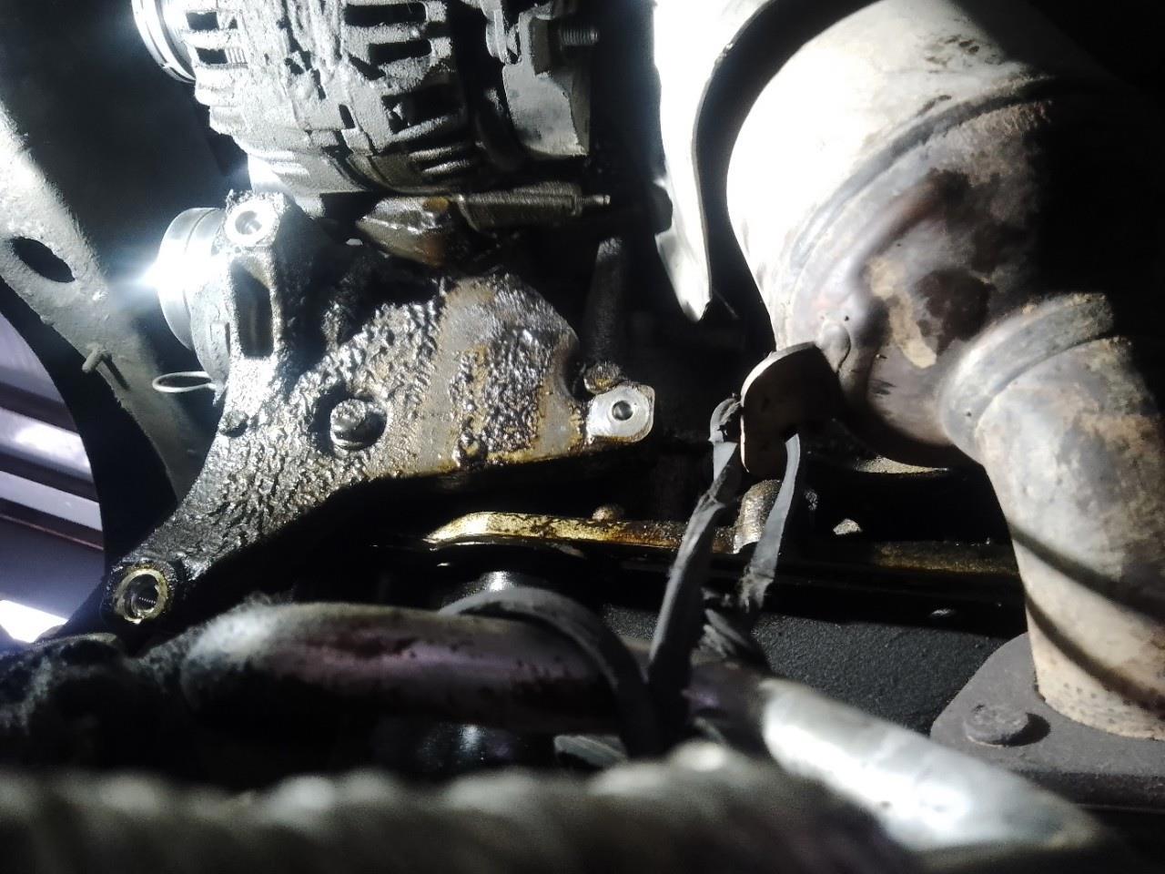Наблюдаем течь масла уровня "ручей". А чтоб снять кронштейн, надо снять термоэкран с выхлоп, ибо он мешает достать один болт крепления, который примерно вот там снизу: