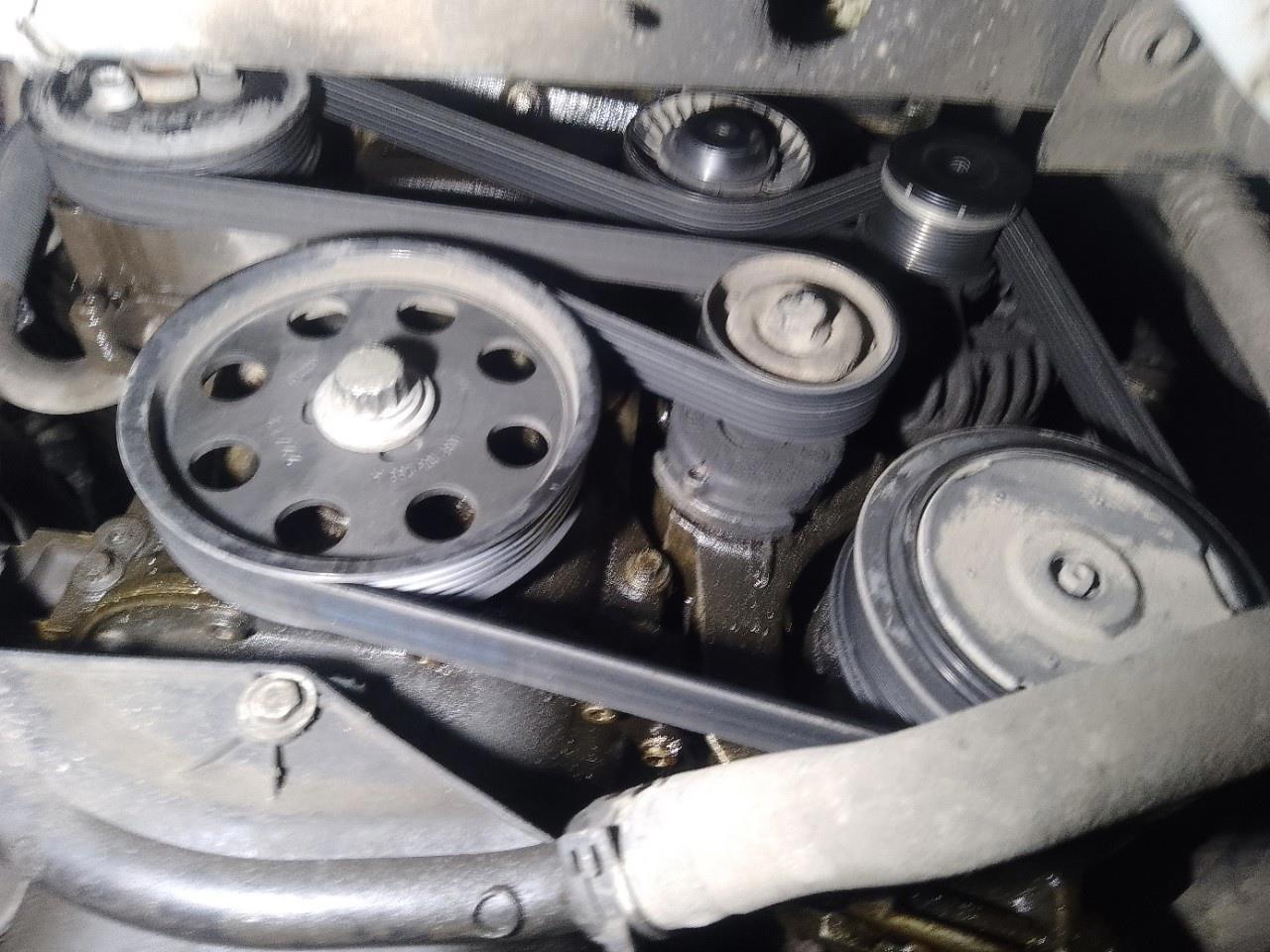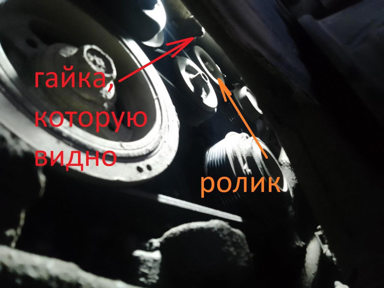 Конечно, цельный подкрылок, который надо снять. Снимаем. И запоминаем конфигурацию ремня. Дальше отводим натяжной ролик, который можно зафиксировать для удобства, и скидываем ремень. Нам мешает обводной ролик около генератора, он закрывает болт крепления сего девайса к кронштейну.