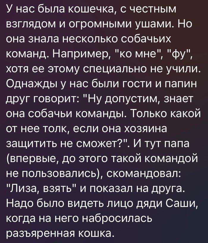 Короче, когда грузину накладывали швы на плечо и шею, он сказал: "Нэ люблю кошэк. Но эту уважаю. Принципиальная кошка".