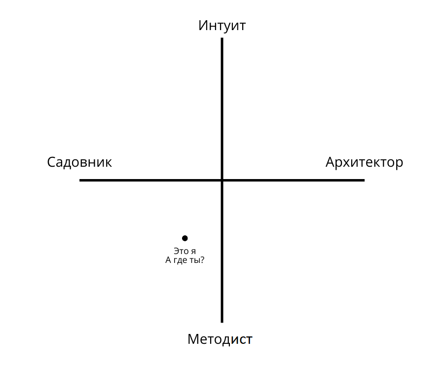 По-хорошему надо было бы охарактеризовать каждый из углов: архитектор-интуит, архитектор-методист, садовник-интуит, садовник-методист (АИ, АМ, СИ, СМ), – но, знаете, пост и так получился слишком большой, так что в другой раз))