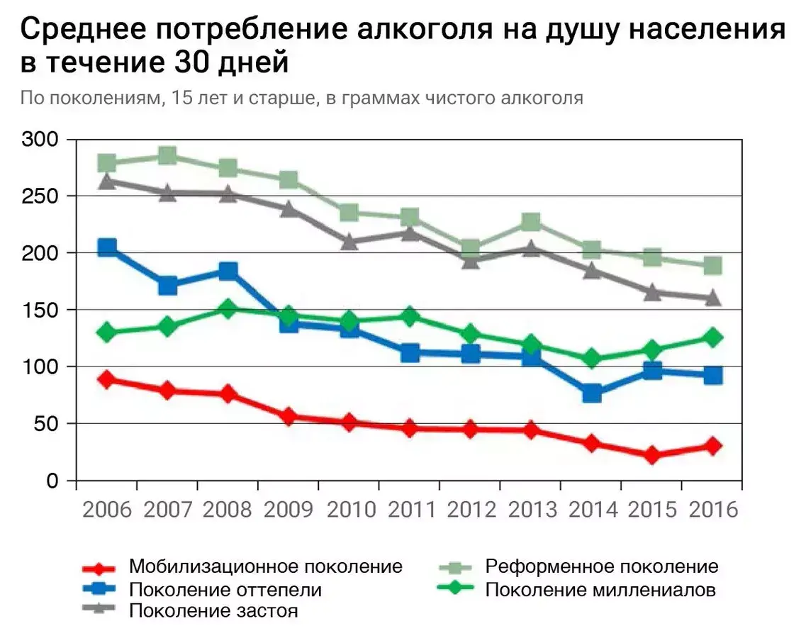 Как я понимаю, на топе по бухлу - девяностники. Хотя "поколение оттепели" и "мобилизационное поколение" мало пьют просто по возрастным причинам.