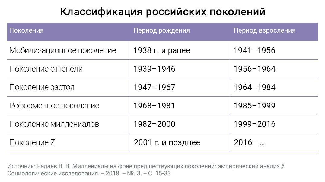 Автор: Игорь АретаноКлассификация поколений россиян (источник указан на картинке). Вроде бы, и повода для дискуссий нету: