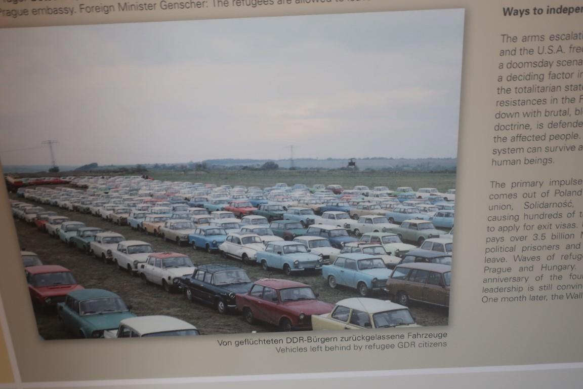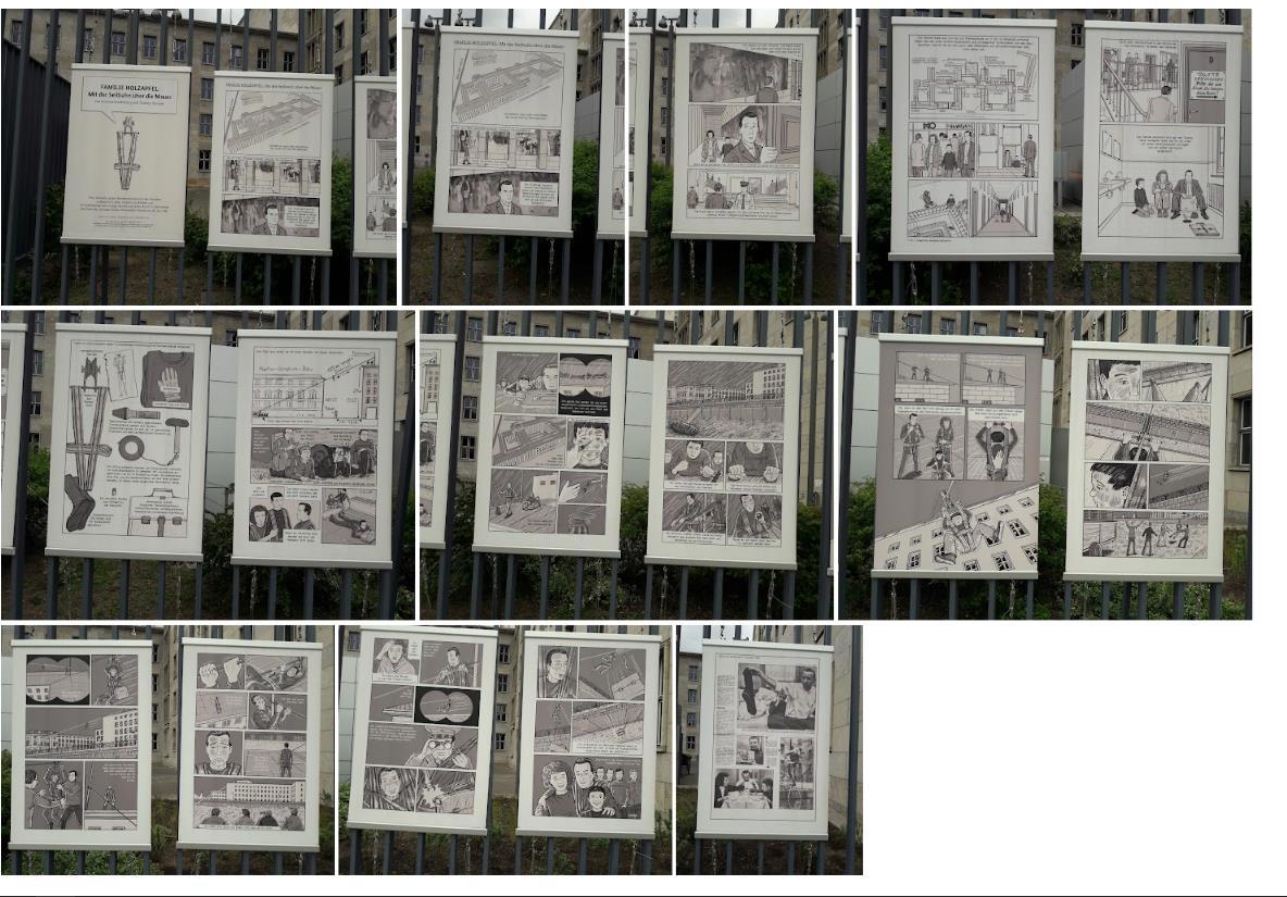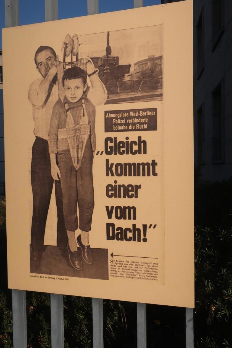 Жена была поражена щитами на улице, которые описывали историю побега семьи Холзапфел в 1965 году в Западный Берлин из ГДР. Они спрятались в туалете министерства финансов ГДР , ждали пока все уйдут, пробрались на крышу, закрепили и сбросили верёвку на другую сторону, там ждали друзья, которые приняли верёвку и закрепили её. Подвешенные к верёвке члены семьи по одному перебрались в Западный Берлин. "Летом 1961 года в одной только половине одного только города, я имею в виду Западный Берлин, население увеличивалось на одного человека каждую минуту. А в Восточном Берлине соответственно каждую минуту население на одного человека сокращалось. И пришлось возвести восьмое чудо света – Берлинскую стену, а всех, кто через стену пытался перебраться, – убивать. Проблема осложнялась тем, что и пограничники тоже люди. Сами пограничники тоже бежали через проволоку. И тогда пришлось вводить электронную защиту, перекрывать подходы к границам минными полями, барьерами, которые не проломишь ни танком, ни бульдозером… А люди бежали." Не совсем уверен про "каждую минуту": из Восточной Германии с января 1951 года по апрель 1953 года бежали 447 тысяч человек, то есть каждые 2.5 минуты один человек в этот промежуток времени.