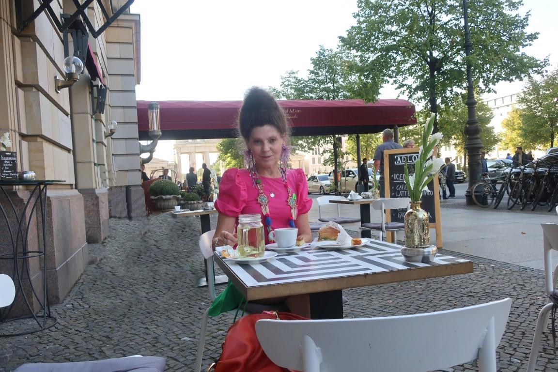 С голодухи, что ли? Вон как щёки набила! Миленькое кафе при гостинице Кемпинский.