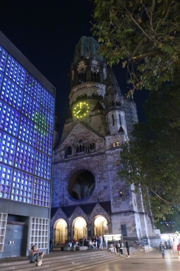 Руины Кайзер Вильгельм церкви так и остались после войны - её не стали восстанавливать. Она была укреплена, получила часы, и мемориальный зал на первом этаже. Стоит как памятник войны и в народе называется "пустой зуб".