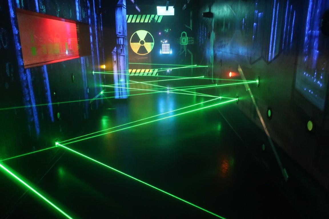 Этот проход защищён невидимыми инфракрасными лучами, но для идущего они подсвечиваются, как будто у него на голове специальные очки. Однако, эти лучи невидимы для наблюдающего снаружи, поэтому уморительно наблюдать нелепые и необъяснимые телодвижения того, кто внутри - посмотрите фильмик.