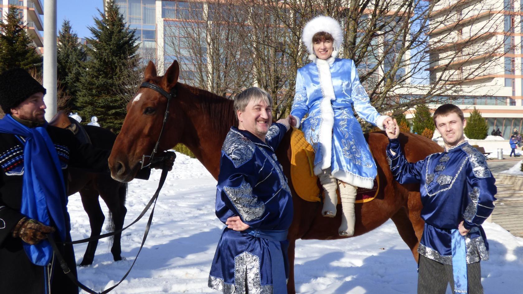 А затем пришли казаки с казачьего подворья и привели коней. Хотя санаторий и взрослый, но с детьми приезжать не запрещается. Поэтому детей было достаточно. чтобы с радостными криками броситься к коням! И казаки устроили им катание верхом по территории санатория. Весь этот антураж создавал неповторимое настроение!