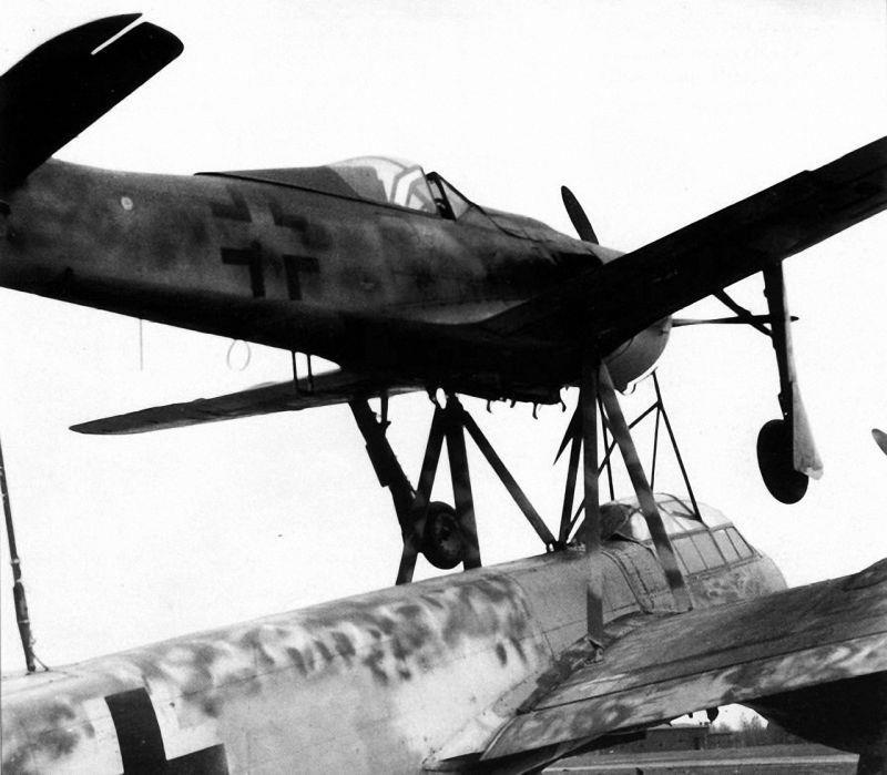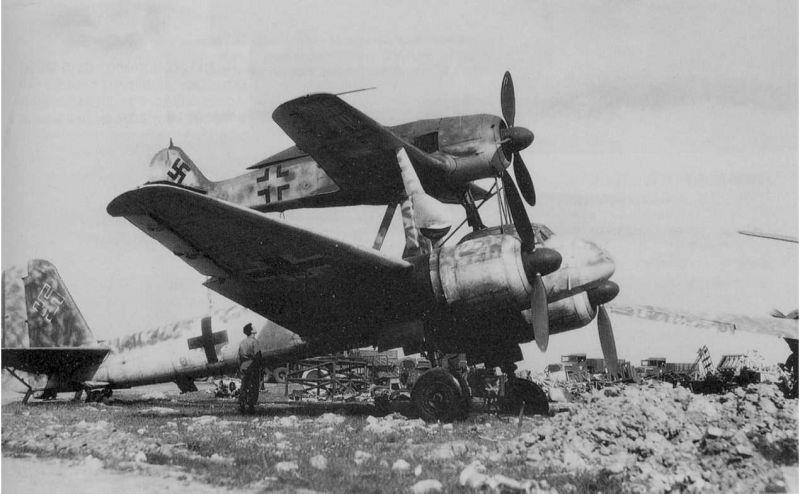 Автор: Николай БергУдарная система Mistel — немецкий проект беспилотного снаряда с мощным кумулятивным зарядом в носовой части списанного бомбардировщика Юнкерс Ю-88. Управляется из одноместного истребителя, укрепленного над фюзеляжем самолета-снаряда.бомбардировщик Юнкерс Ju 88G с мощным зарядом взрывчатки, управляемый с закрепленного над ним истребителя Фокке-Вульф Fw 190. Аэродром Мерзебург (Германия). 1945 г.