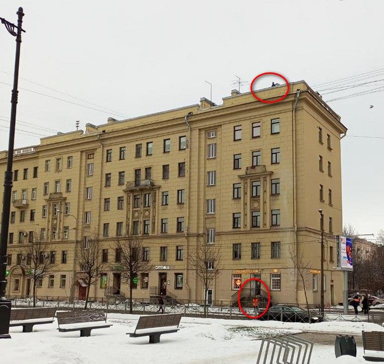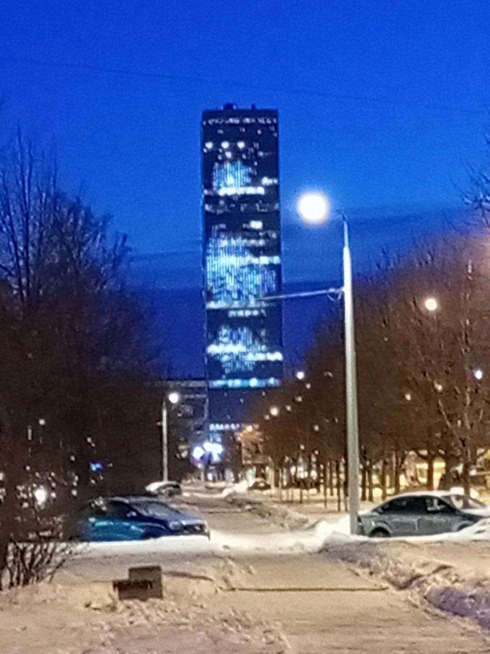 Подсветка небоскреба - падающие снежинки, но фотка расплылась: