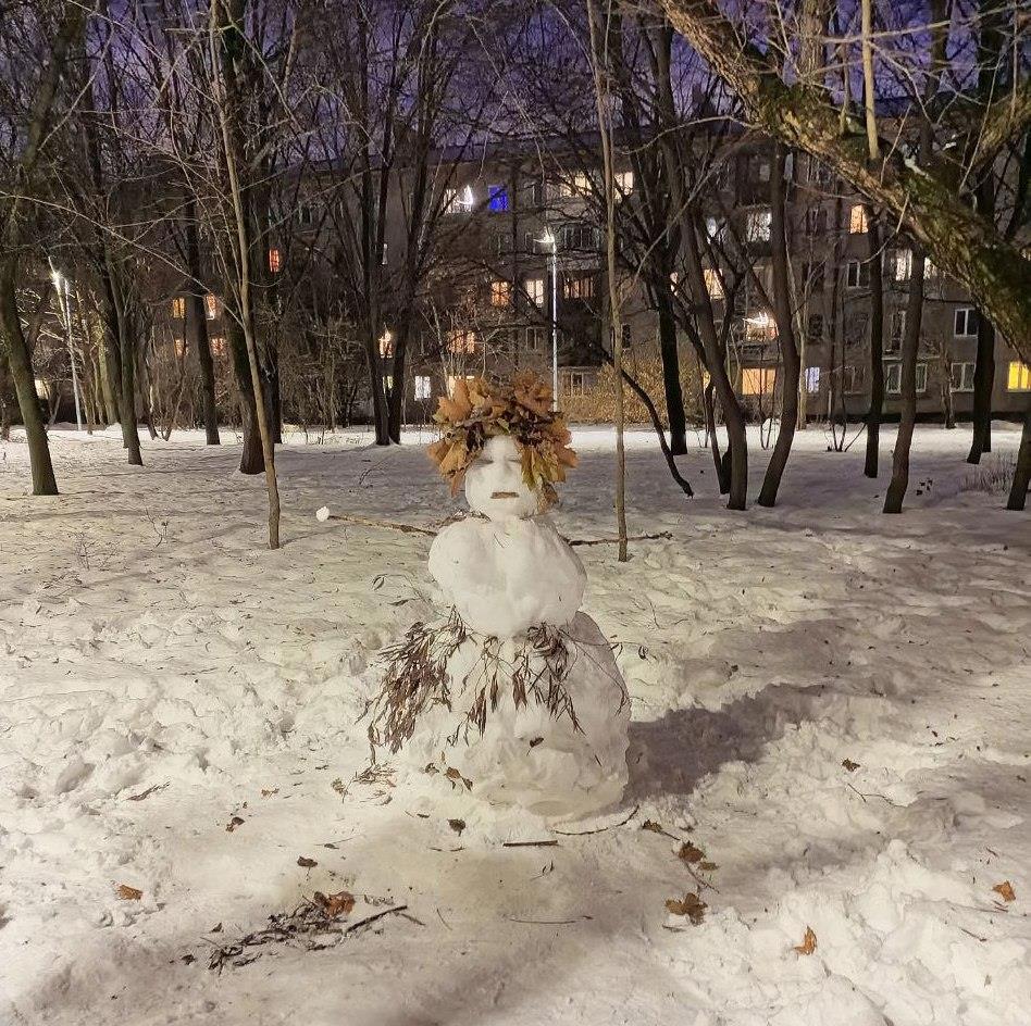 Снежная баба в соседнем дворе. Выражение лица соответствует не шибко новогоднему настроению.